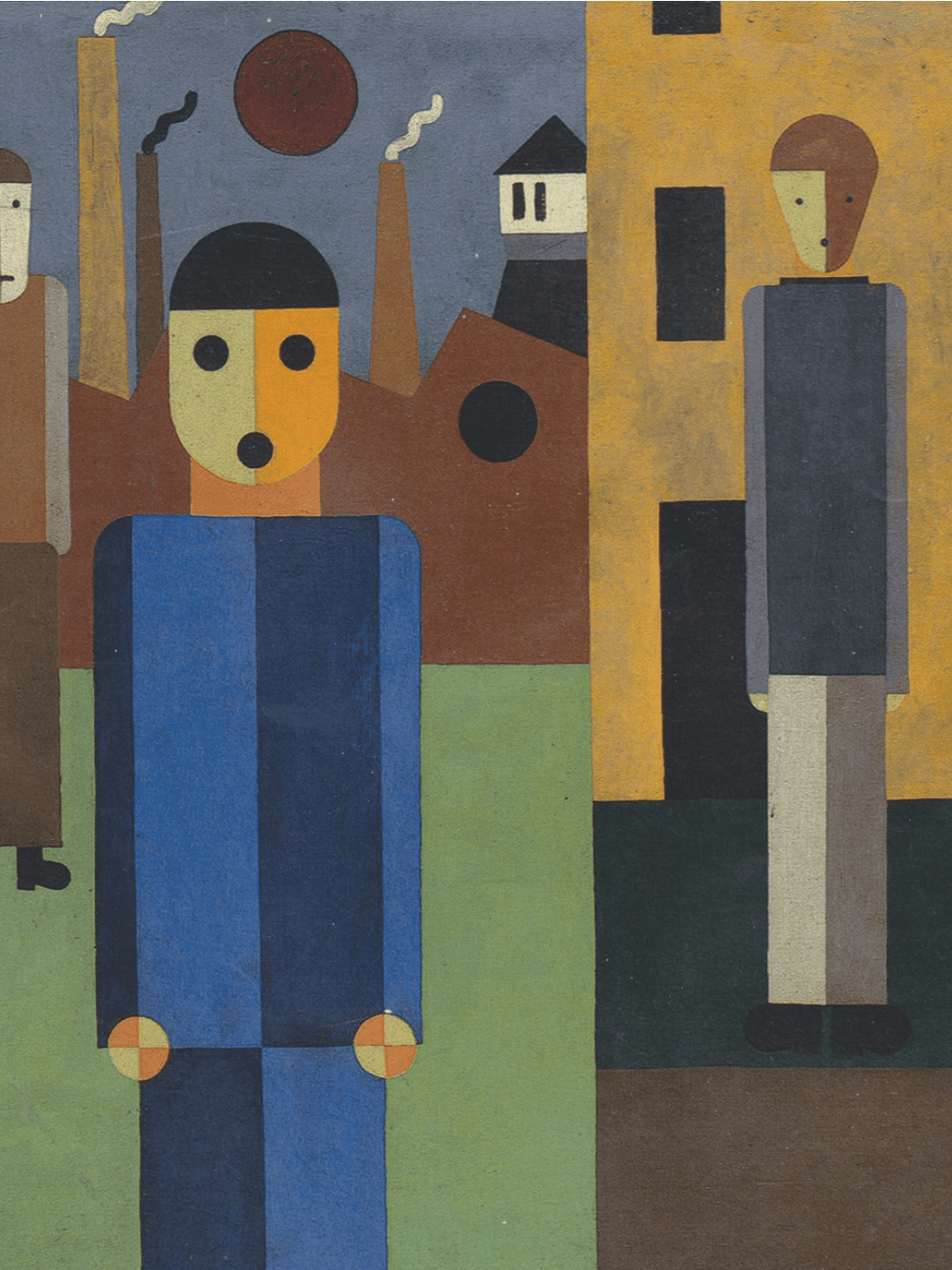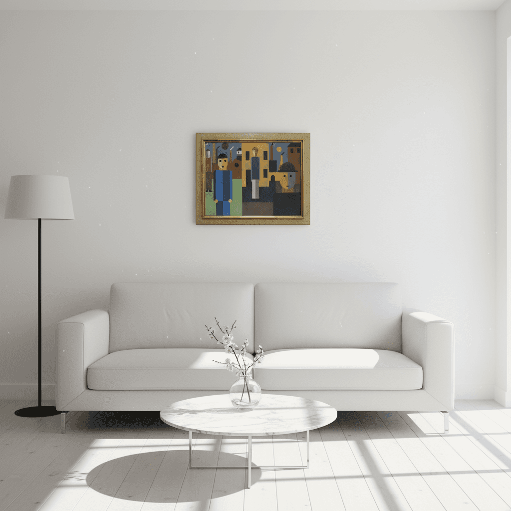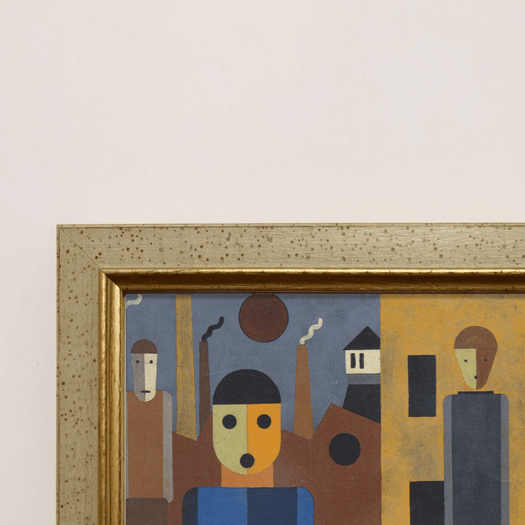 กรอบรูปไม้แท้ จาก ญี่ปุ่นสภาพใหม่ แนว Vintage ภาพพิมพ์ สไตล์สีน้ำมัน บนผ้าใบ Four Men in front of Factories (1926) Franz Wilhelm Seiwert (German, 1894 – 1933)