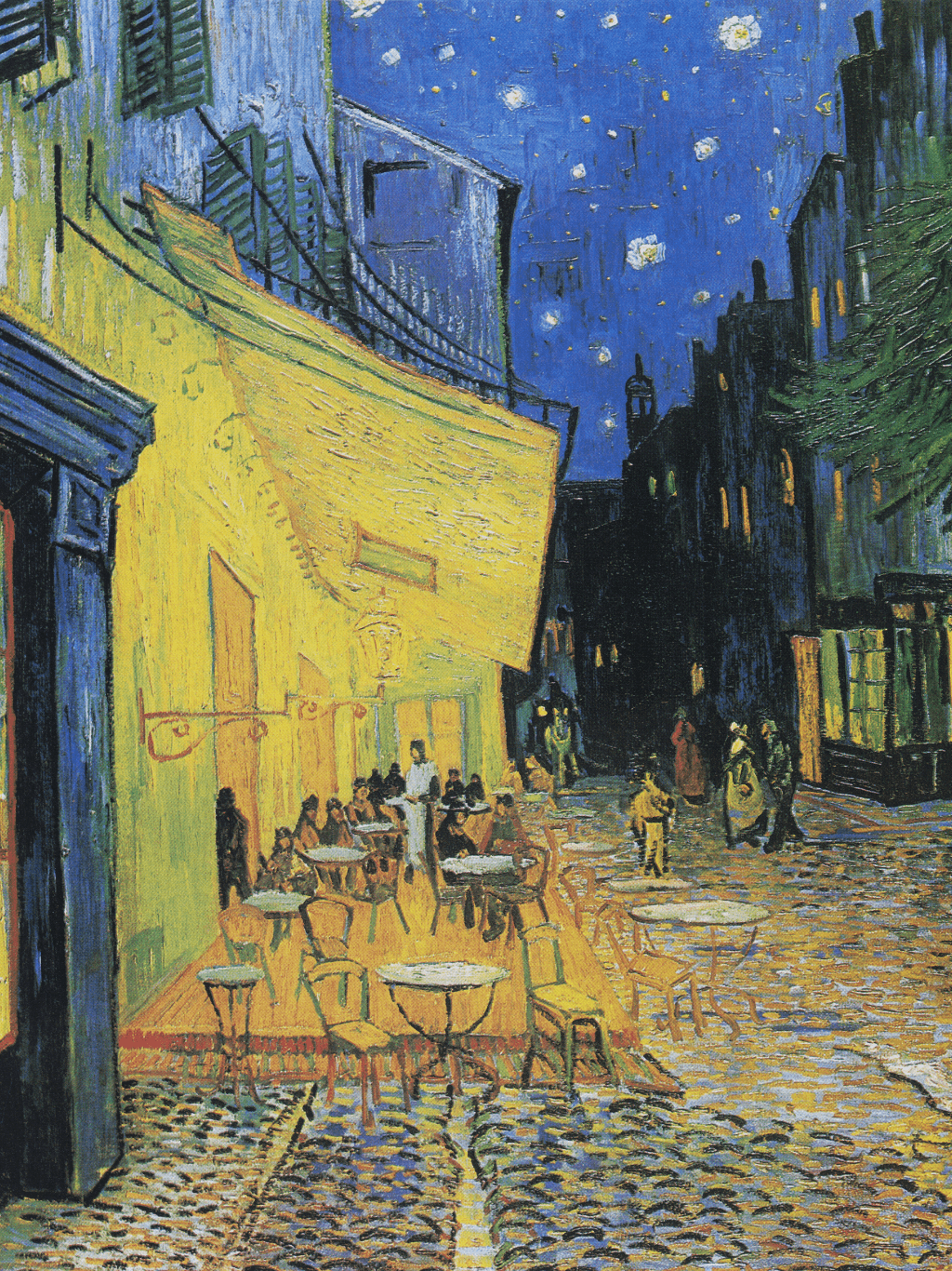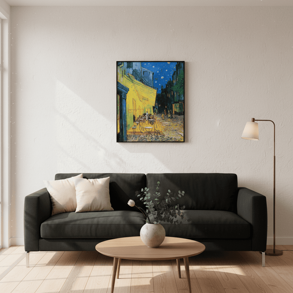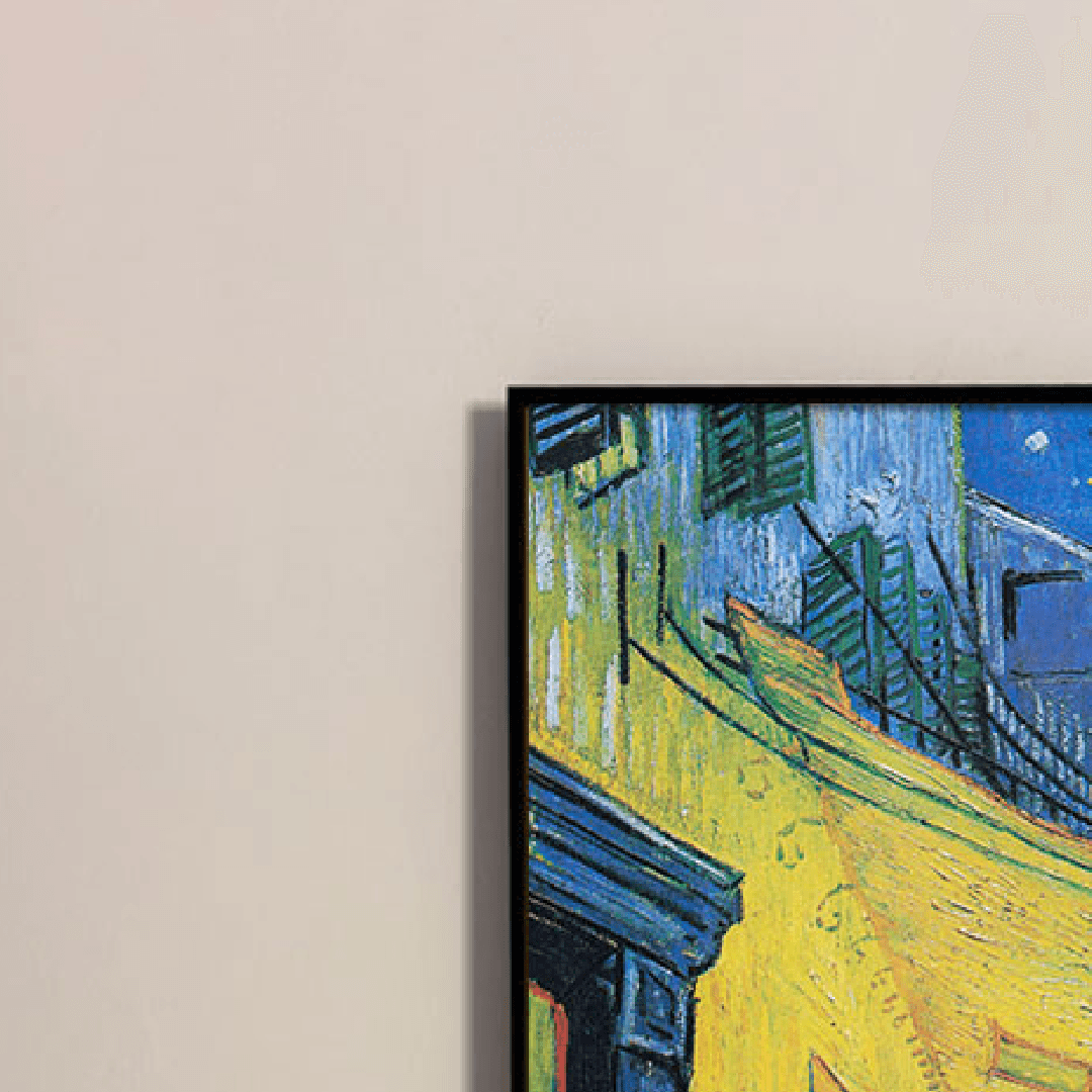 กรอบรูปโลหะสีดำด้าน ภาพพิมพ์ สไตล์สีน้ำมัน บนผ้าใบ ภาพ Café Terrace at Night ของ Vincent van Gogh ในปี ค.ศ. 1888