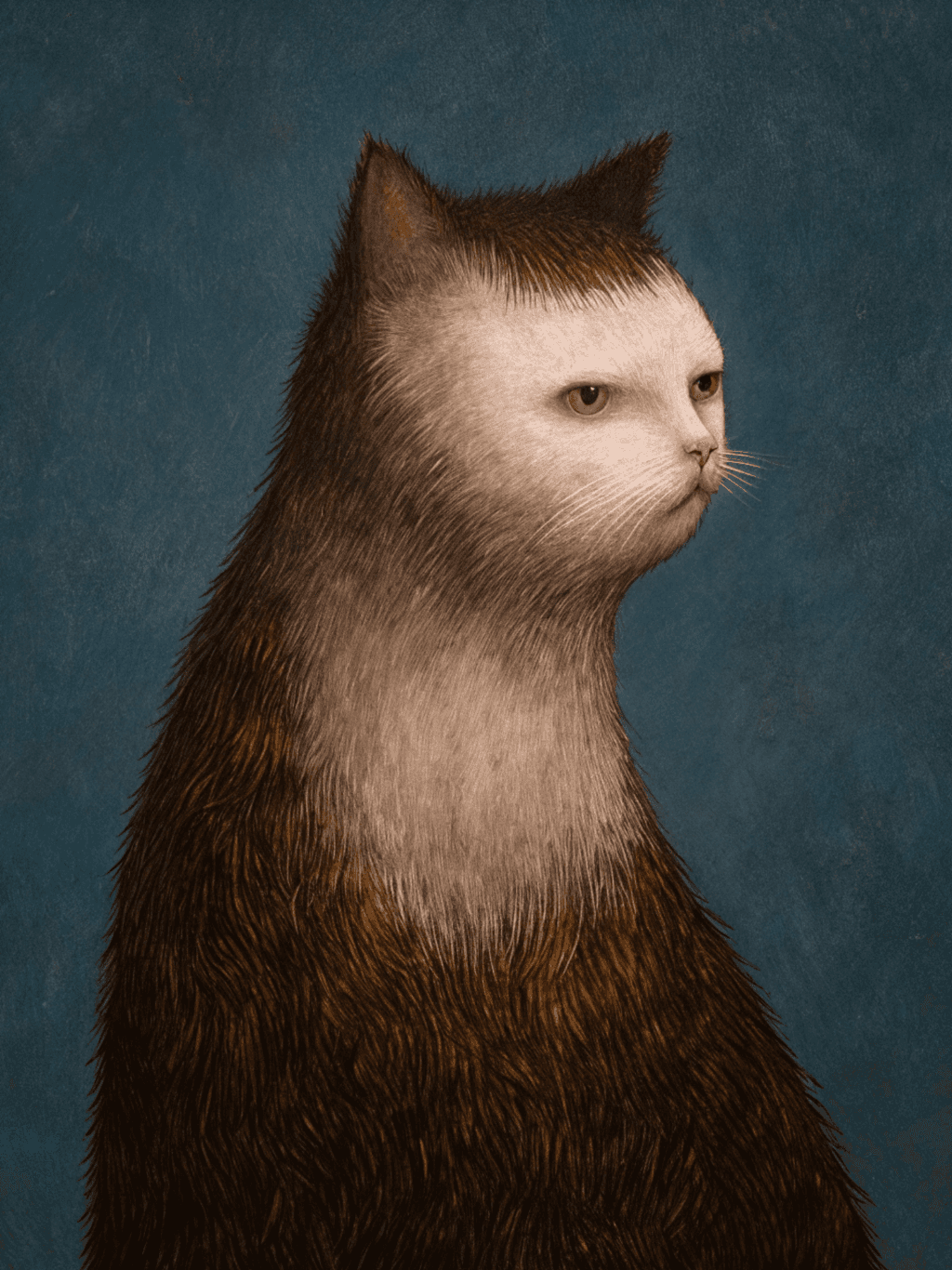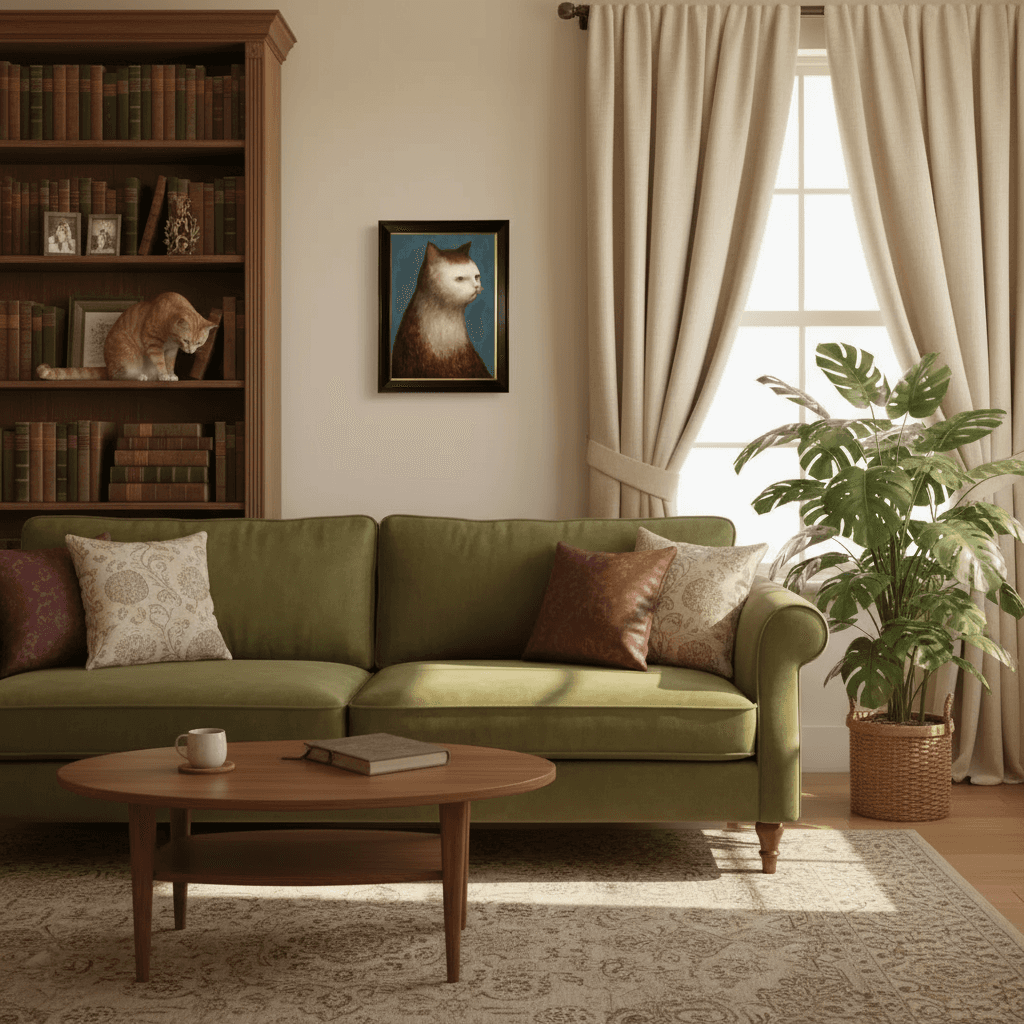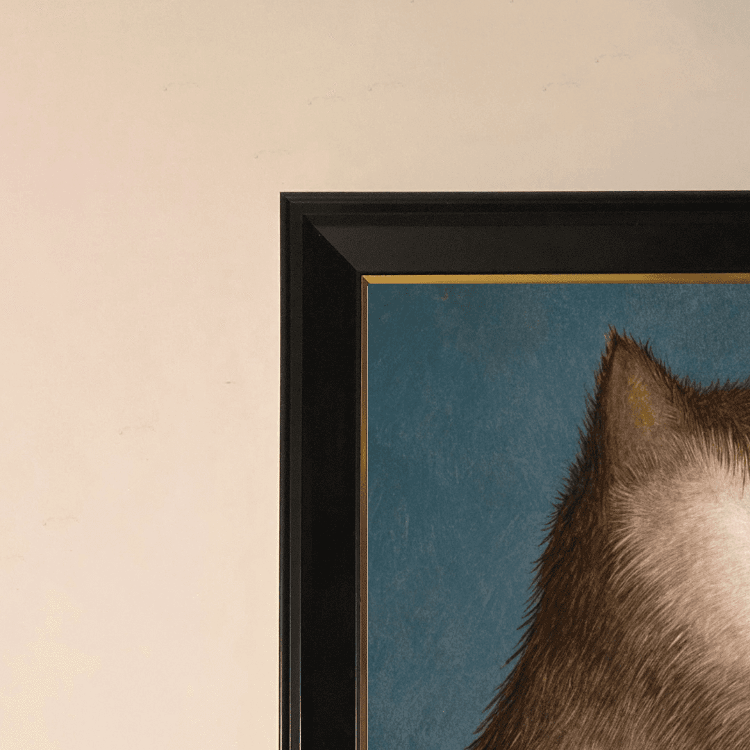กรอบรูปสีดำด้านขอบทอง ภาพพิมพ์ สไตล์สีฝุ่น บนผ้าใบ ภาพ The Cat