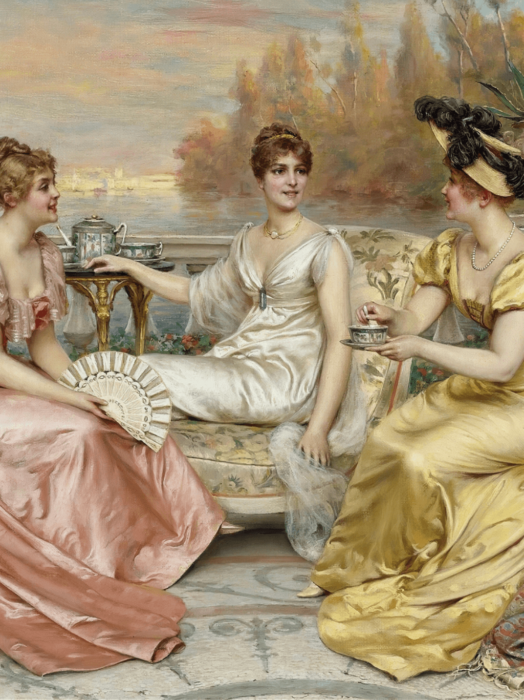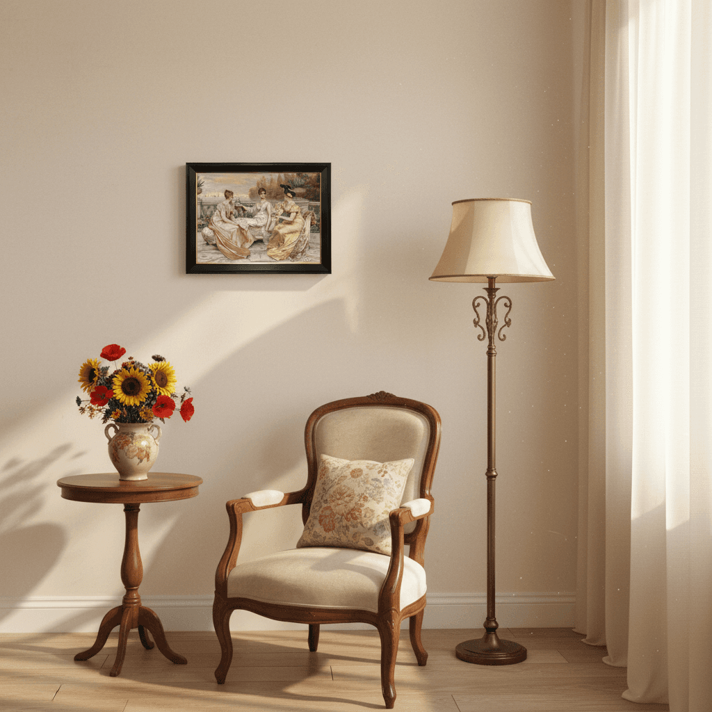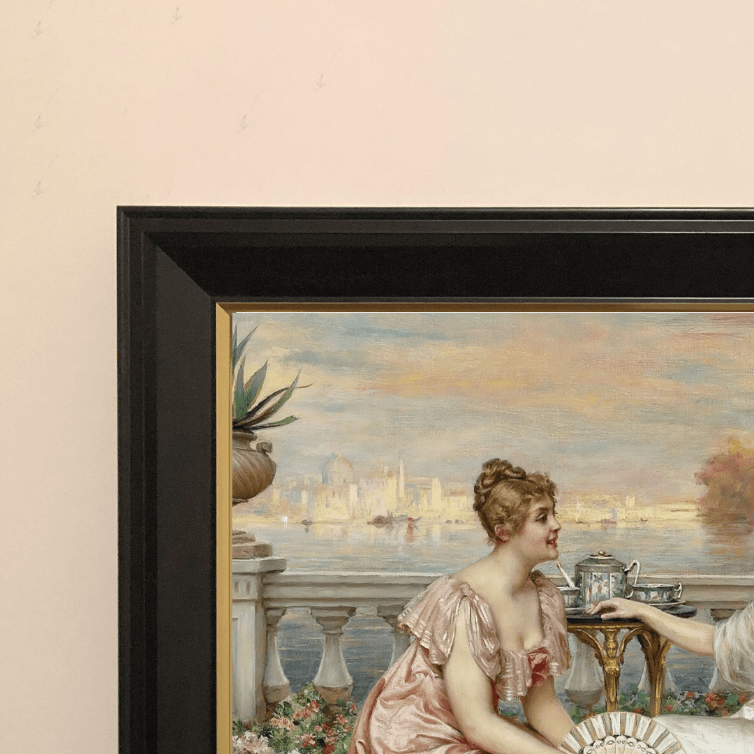 กรอบรูปสีดำด้านขอบทอง ภาพพิมพ์ Woodcut บนผ้าใบ ภาพ Tea On The Terrace Frédéric Soulacroix (French, 1858–1933)
