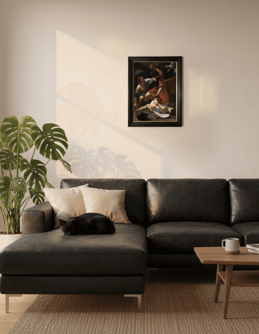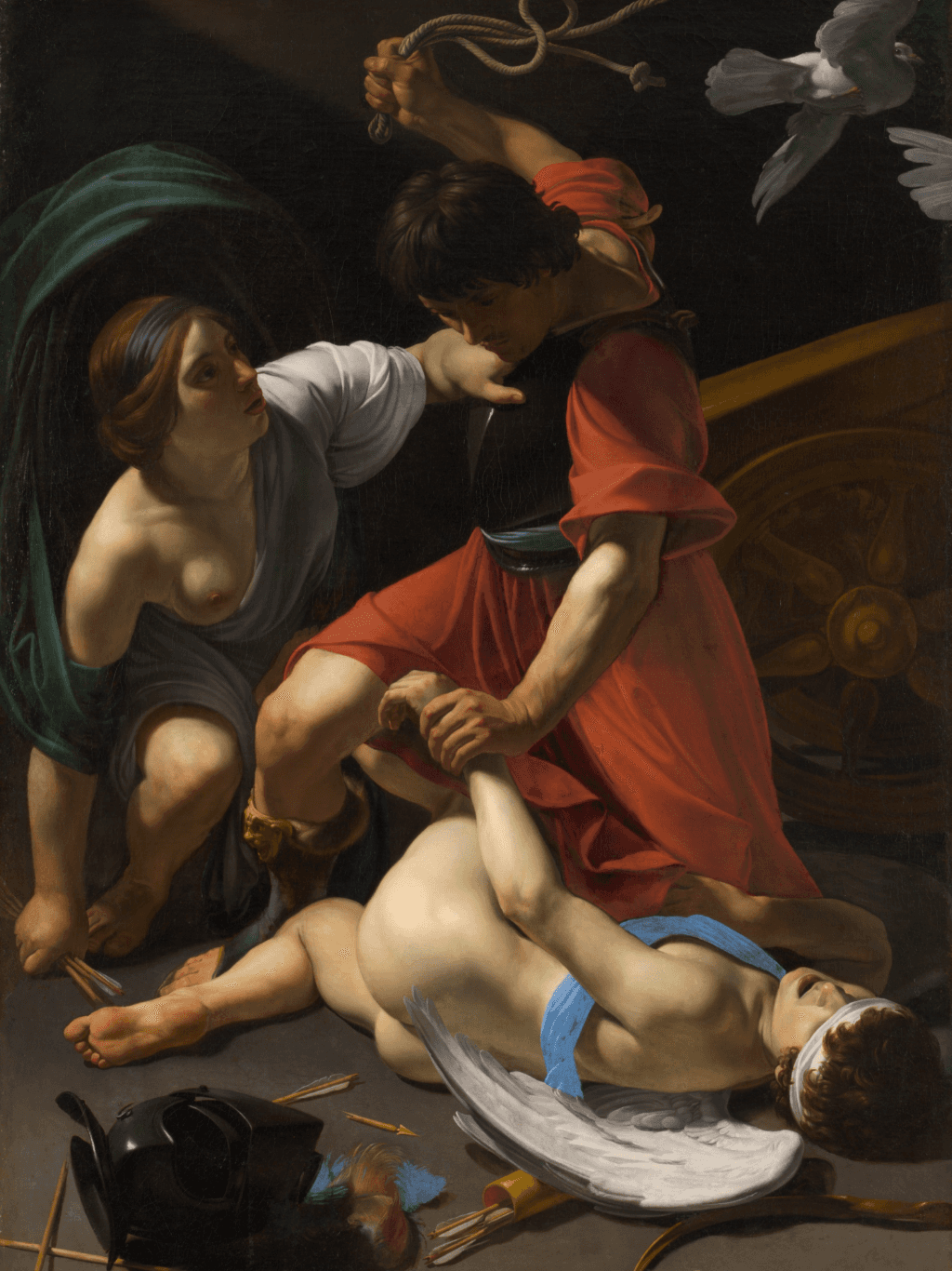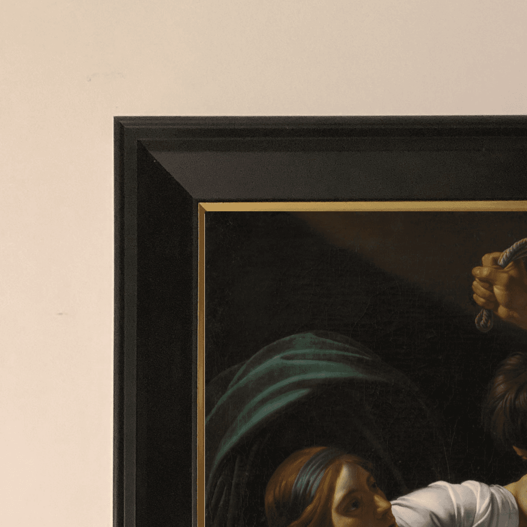 กรอบรูปสีดำด้านขอบทอง ภาพพิมพ์ สไตล์สีฝุ่น บนผ้าใบ ภาพ Cupid Chastised by Bartolomeo Manfredi