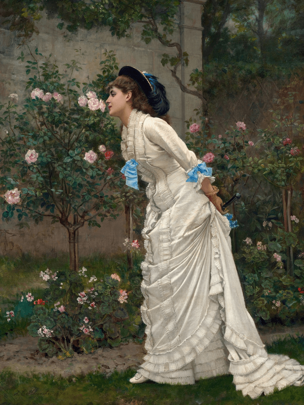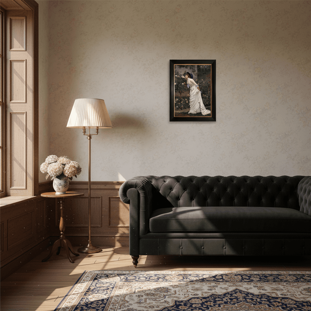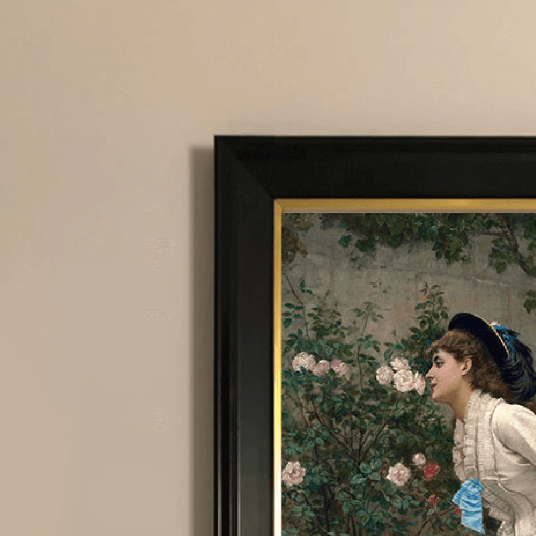 กรอบรูปสีดำด้านขอบทอง ภาพพิมพ์ บนผ้าใบ ภาพ Woman And Roses (1879) Auguste Toulmouche (French, 1829 - 1890)