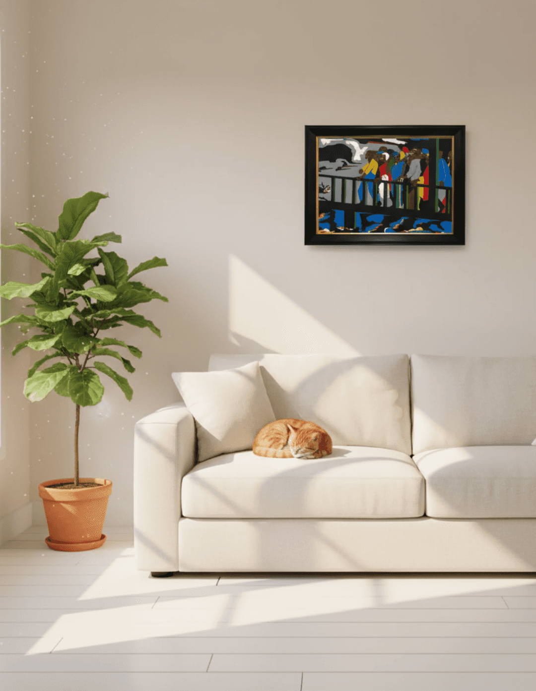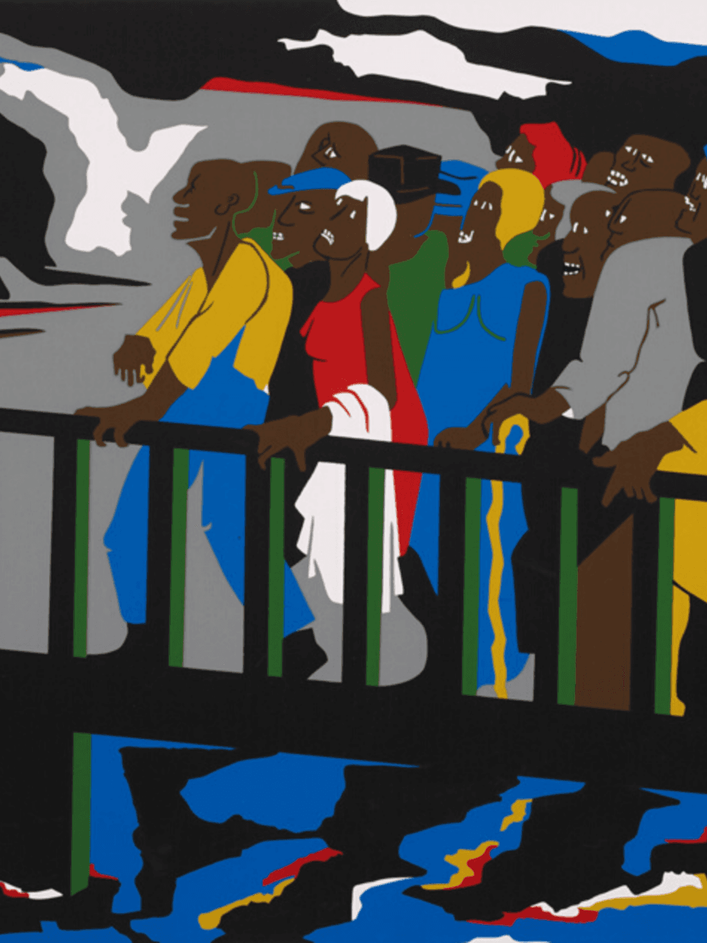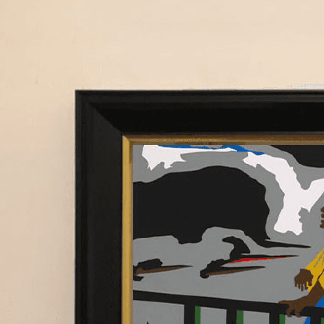 กรอบรูปสีดำด้านขอบทอง ภาพพิมพ์ สไตล์สีฝุ่น บนผ้าใบ ภาพ Confrontation at the Bridge by Jacob Lawrence