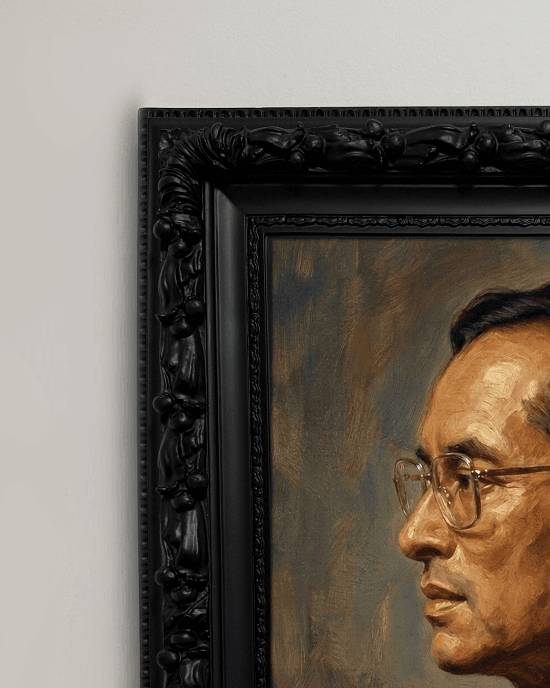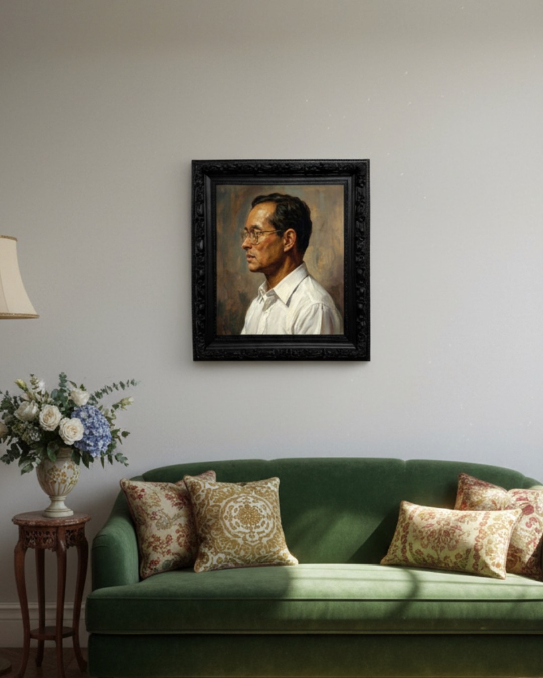 กรอบรูปลายหลุยส์ สีดำด้านขอบใหญ่ งานภาพพิมพ์ สไตล์ สีน้ำมันบนผ้าใบ ภาพ รัชกาลที่ 9