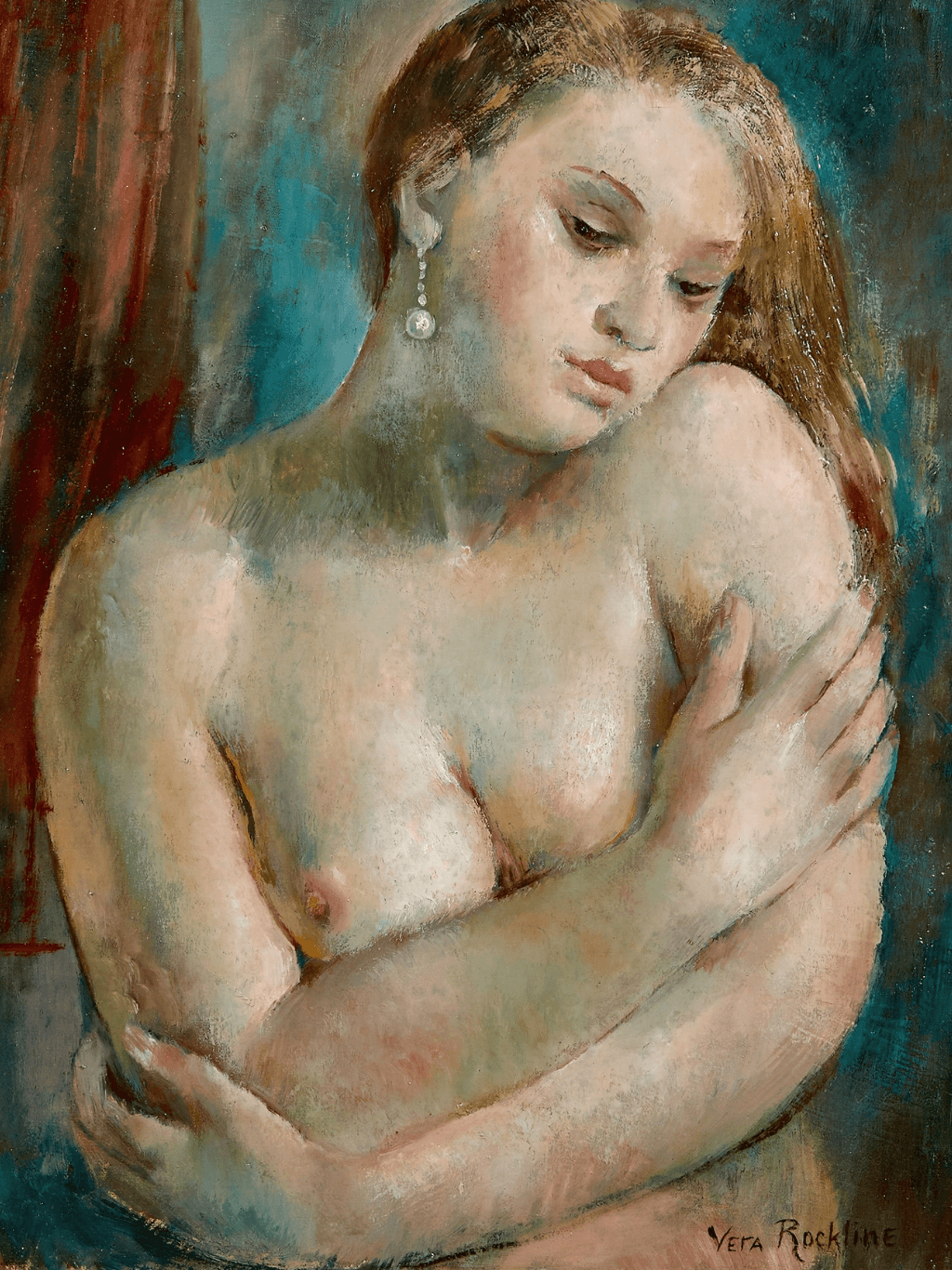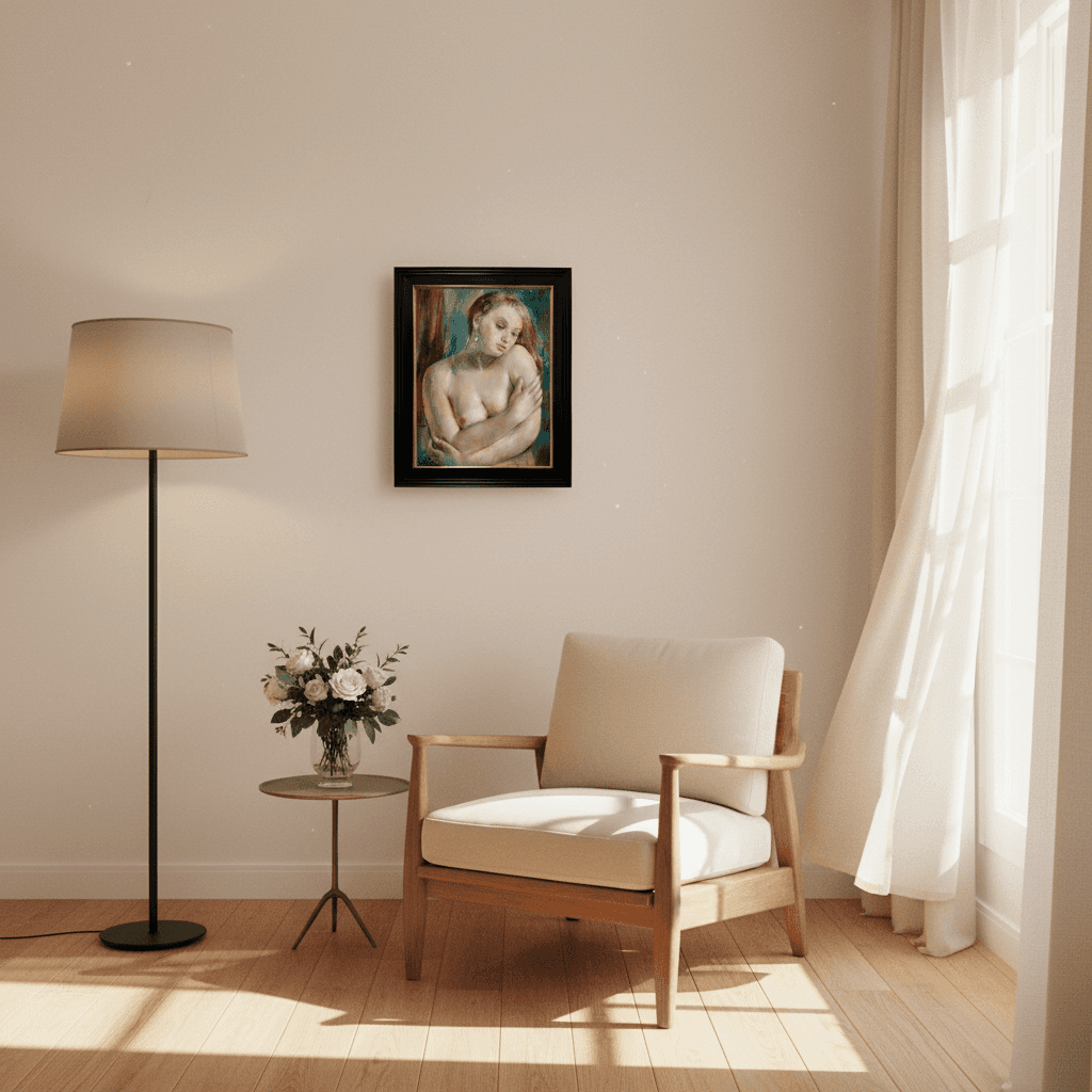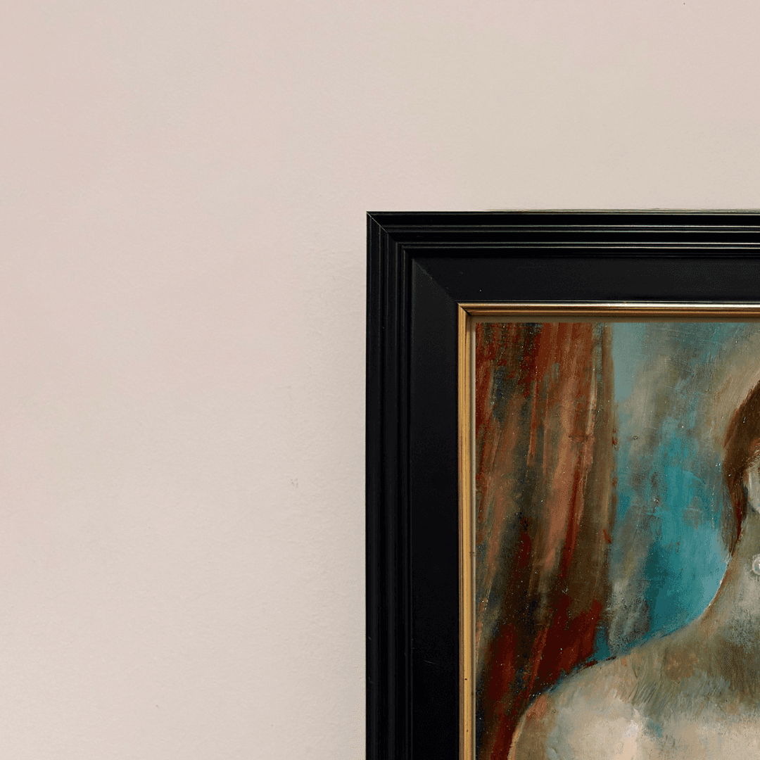 กรอบรูปสีดำด้านขอบทอง ภาพพิมพ์ สไตล์สีน้ำมัน บนผ้าใบ ภาพ Nu à la boucle d’oreille (circa 1930) Vera Rockline (Russian, 1896-1934)
