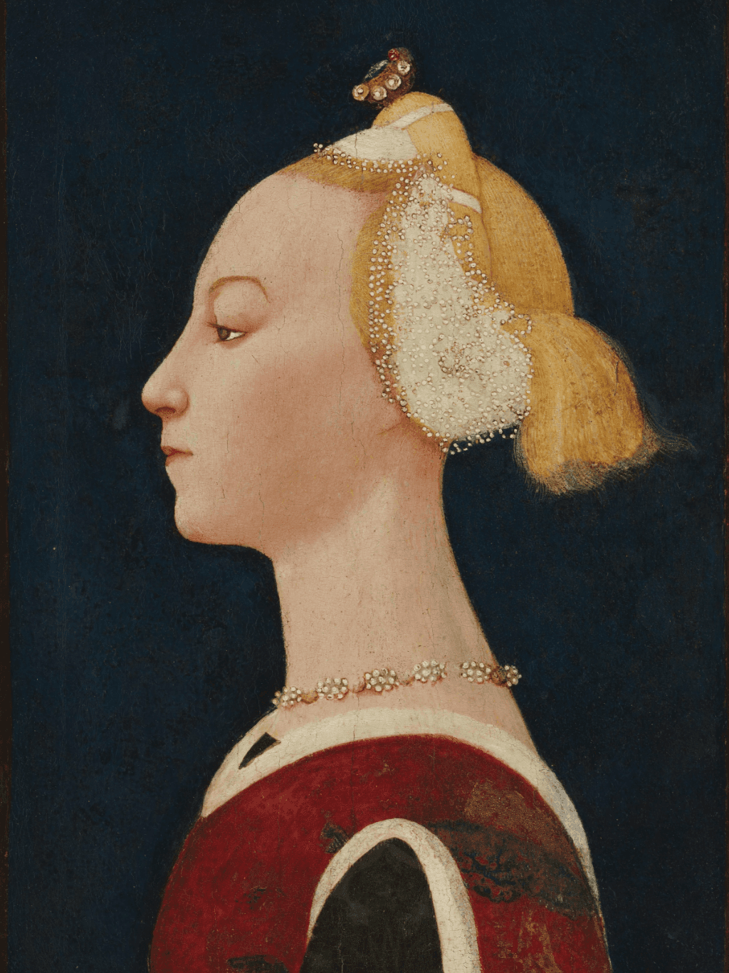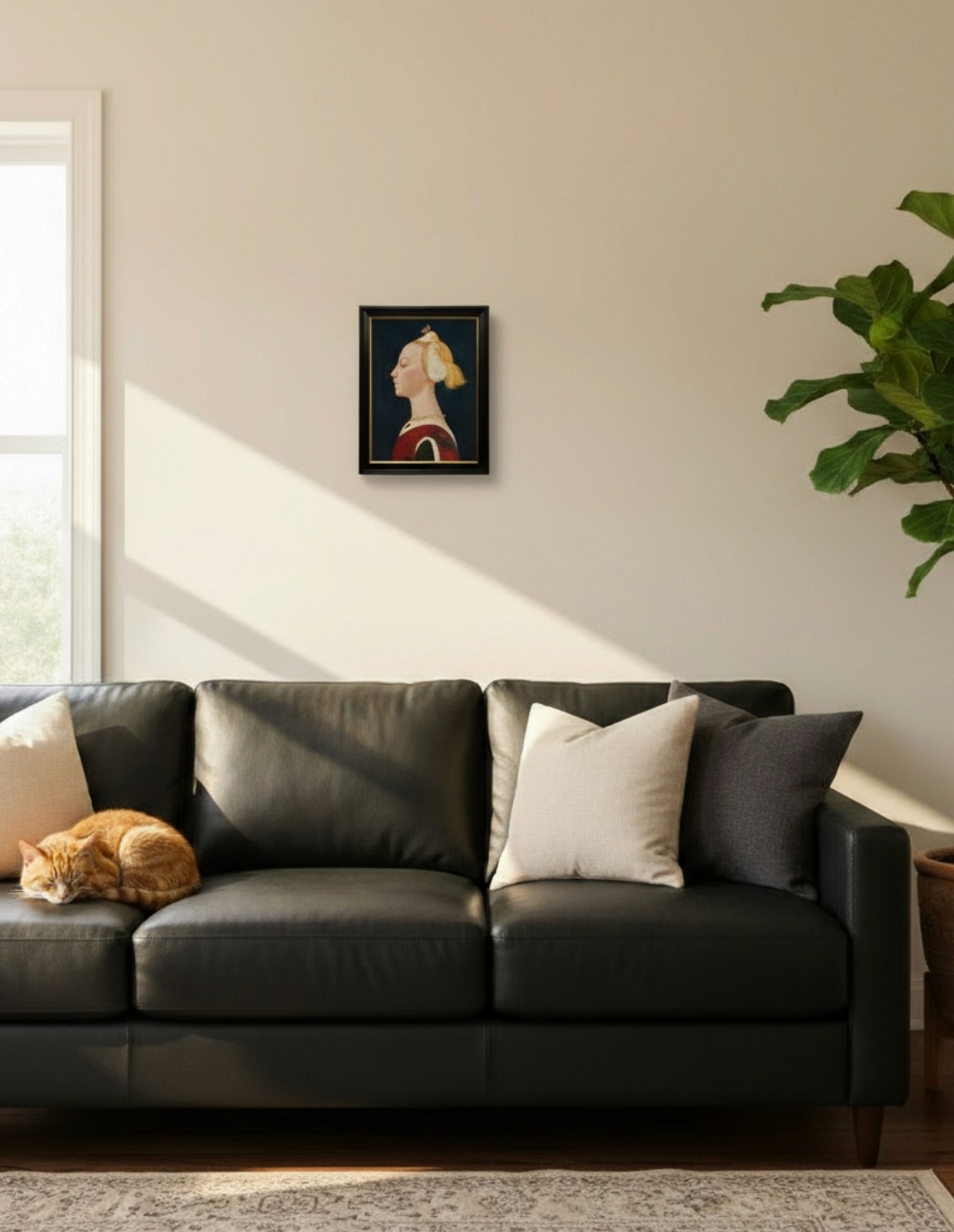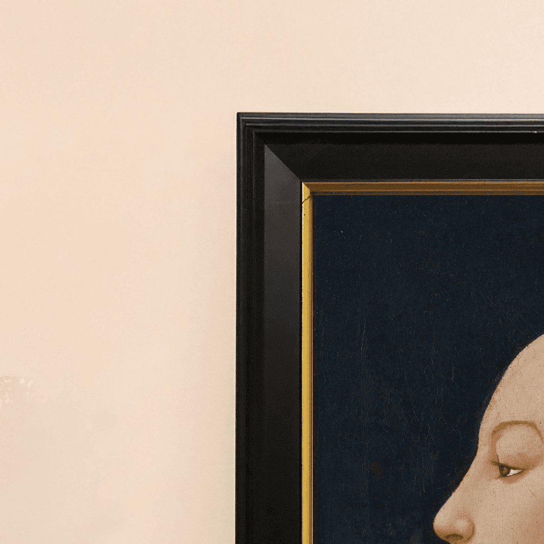 กรอบรูปสีดำด้านขอบทอง ภาพพิมพ์ สไตล์สีน้ำมัน บนผ้าใบ ภาพ Portrait of a Woman by Master of the Nativity of Castello