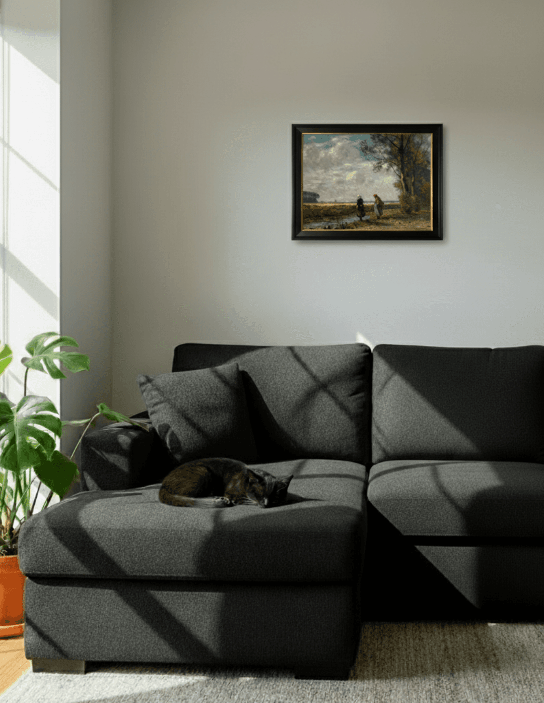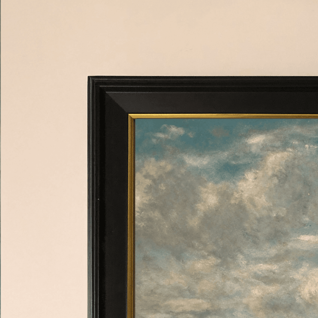 กรอบรูปสีดำด้านขอบทองด้านหน้าติดกระจกตัดแสงสะท้อน ภาพพิมพ์ Land scape สไตล์สีฝุ่น บนผ้าใบ