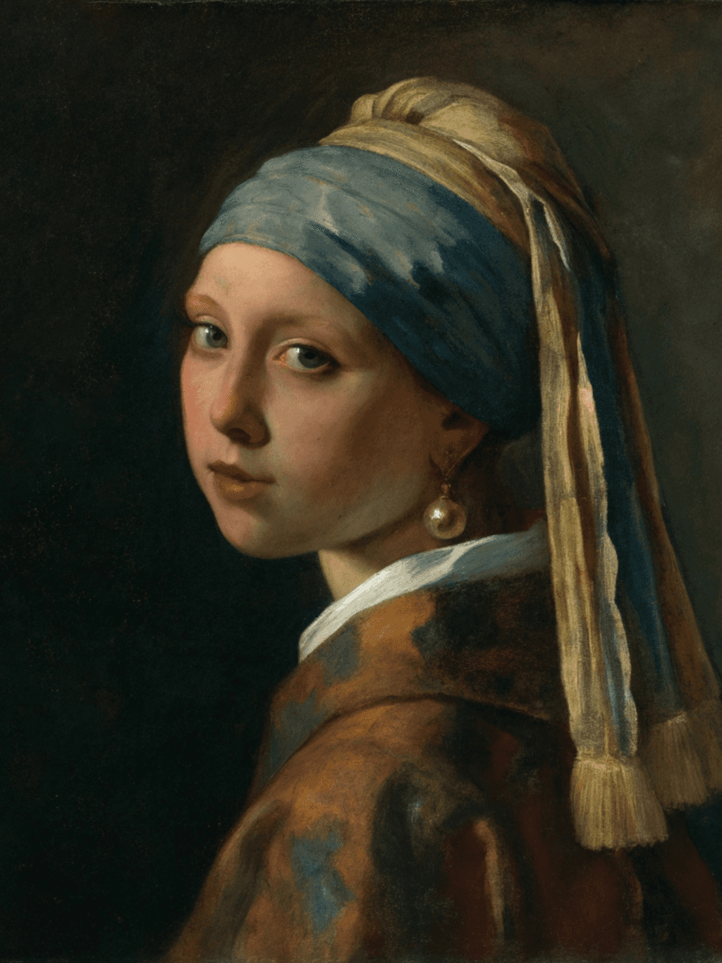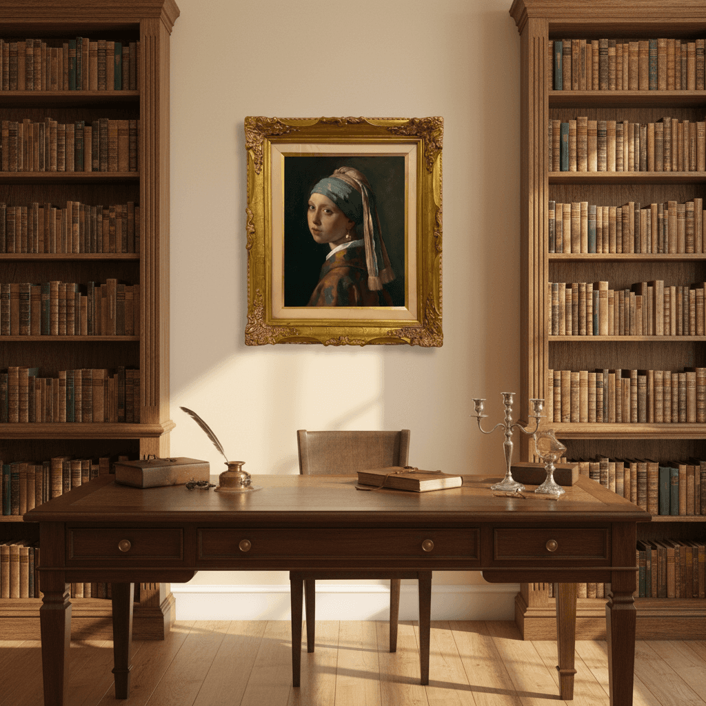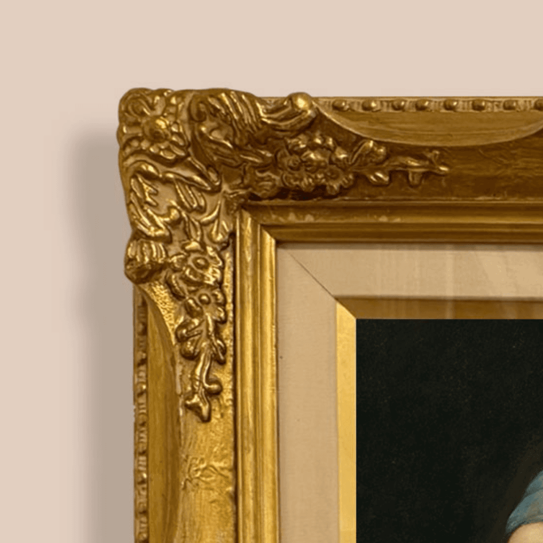 กรอบรูปลายหลุยส์งานเก่าจากญี่ปุ่น ขอบลายใหญ่สีทอง งานภาพพิมพ์ สไตล์สีฝุ่น บน Canvas Re-Imaging ภาพ Girl with a Pearl Earring