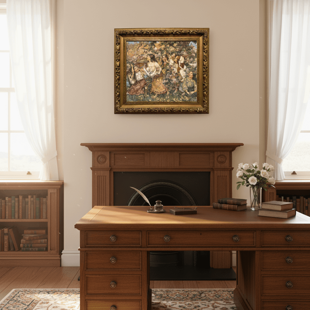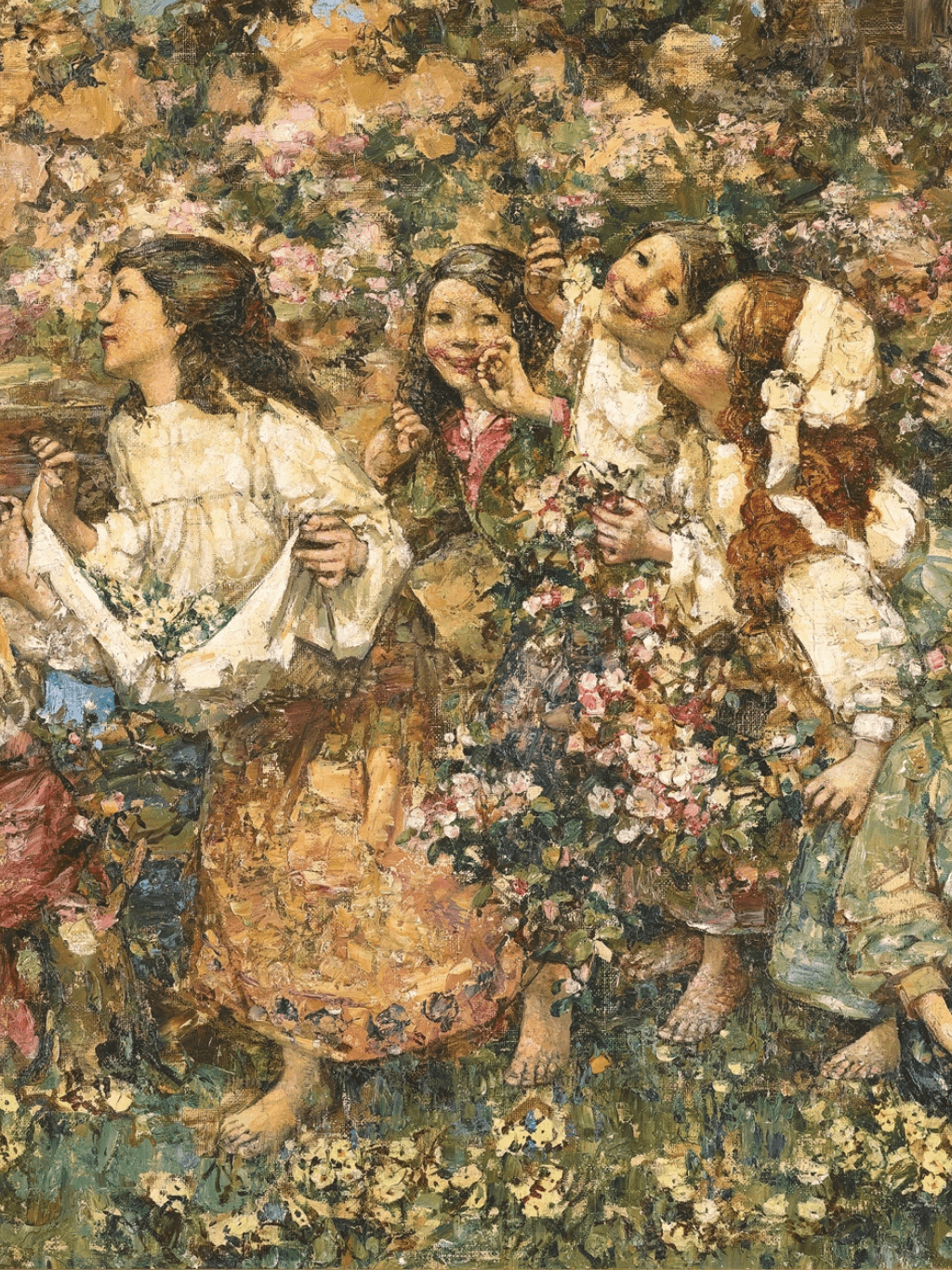 กรอบรูปลายหลุยส์เก่า งานภาพพิมพ์ สไตล์ สีน้ำมันบนผ้าใบ ภาพ A spring-Time Rondeley (1910) Edward Atkinson Hornel (Scottish, 1864–1933)