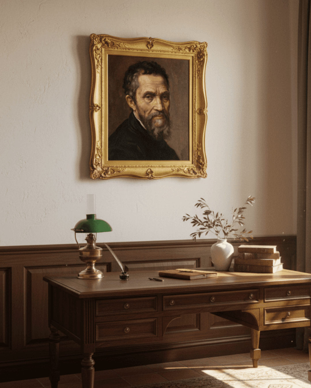 กรอบรูปหลุยส์ขอบ 2 ชั้น ไม้แท้ สีทอง งานเก่า ขนาดใหญ่ งานภาพพิมพ์ความละเอียดสูงสไตล์ สีน้ำมันบนผ้าใบ ภาพ Michelangelo portrait by Daniele da Volterra