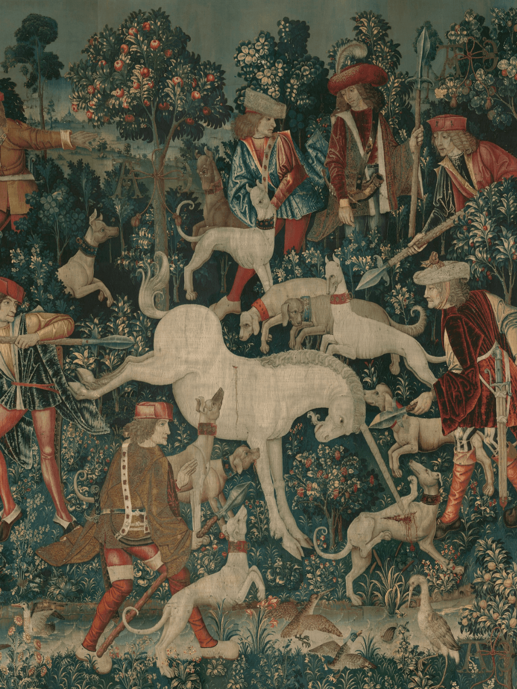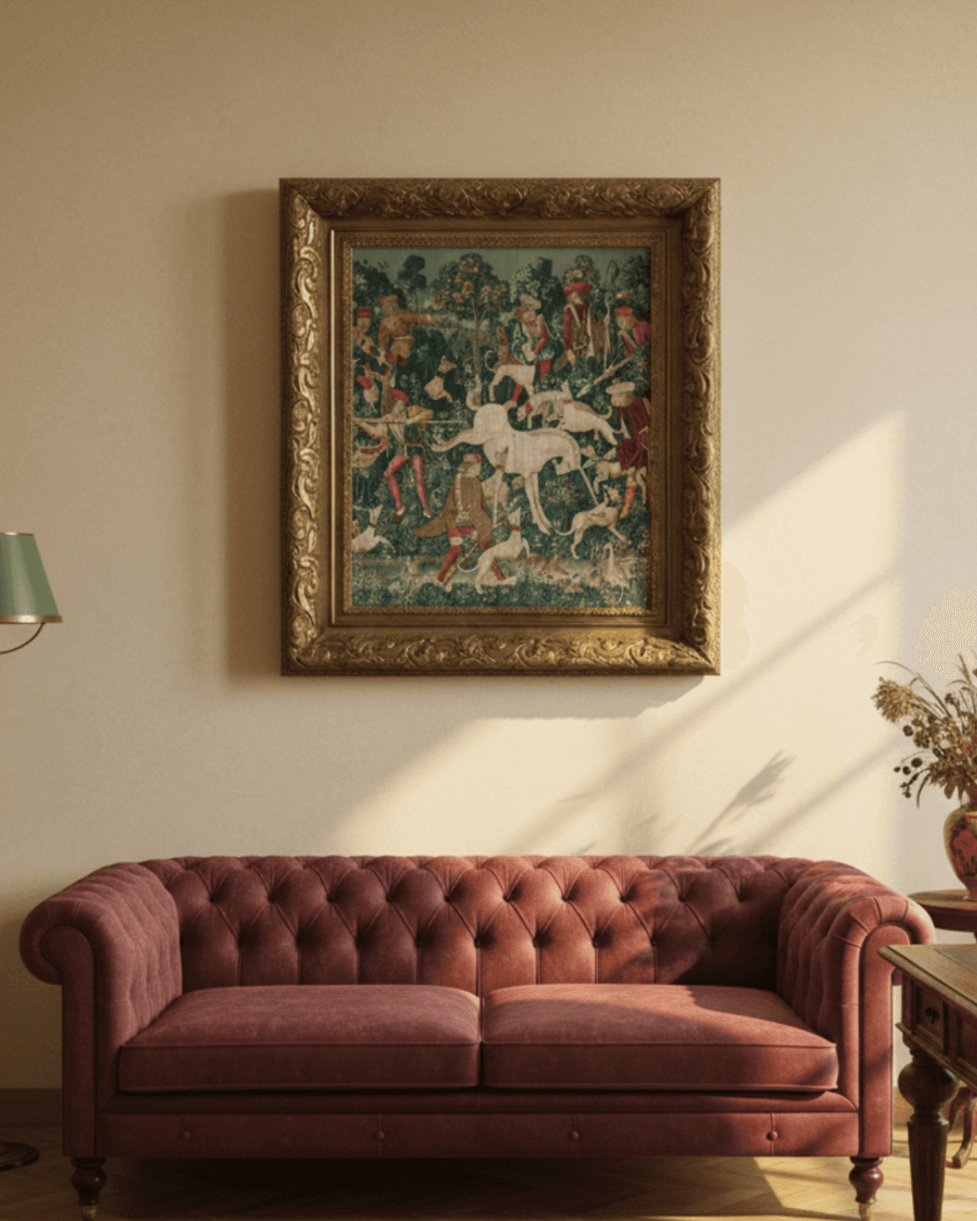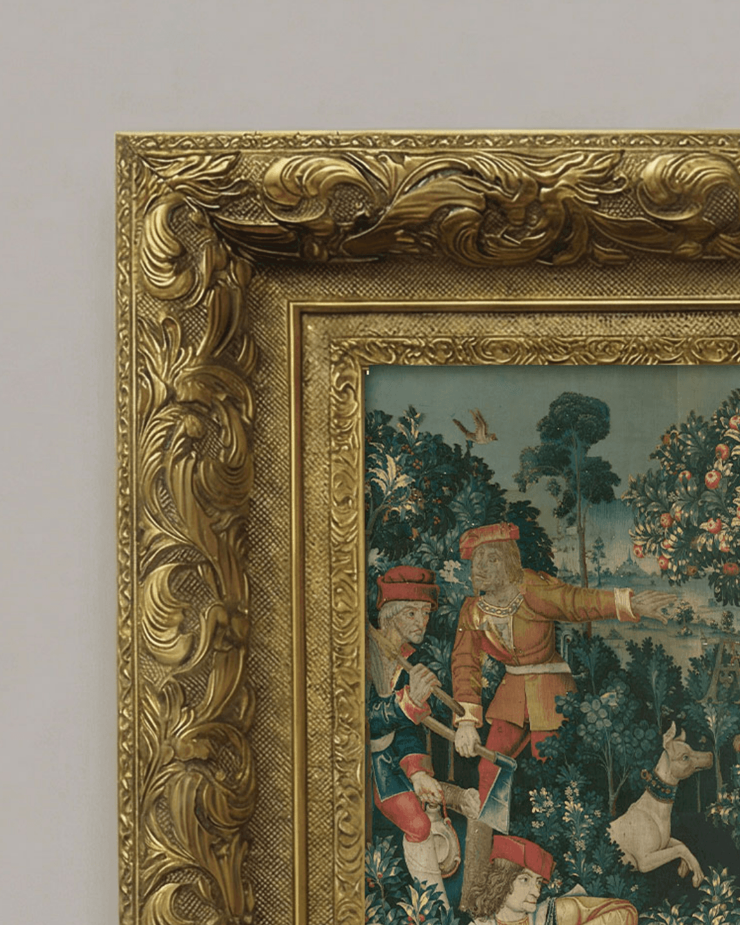 กรอบรูปลายหลุยส์เก่า งานภาพพิมพ์ สไตล์ สีน้ำมันบนผ้าใบ ภาพ The Unicorn Defends Itself (from the Unicorn Tapestries)