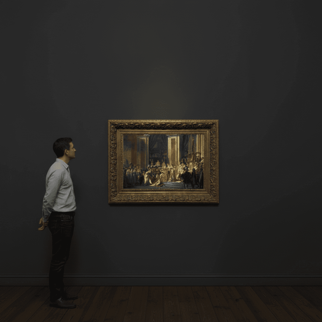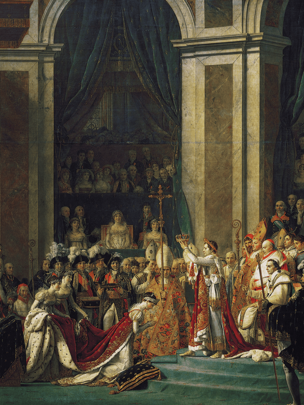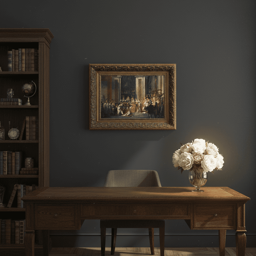 กรอบรูปลายหลุยส์เก่า งานภาพพิมพ์ สไตล์ สีน้ำมันบนผ้าใบ ภาพ Joséphine kneels before Napoléon during his coronation at Notre Dame. Behind him sits pope Pius VII