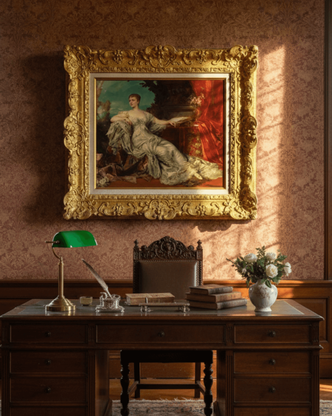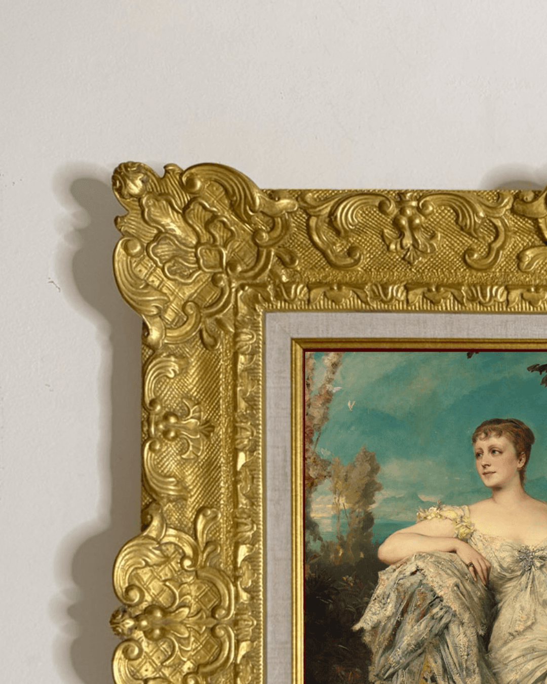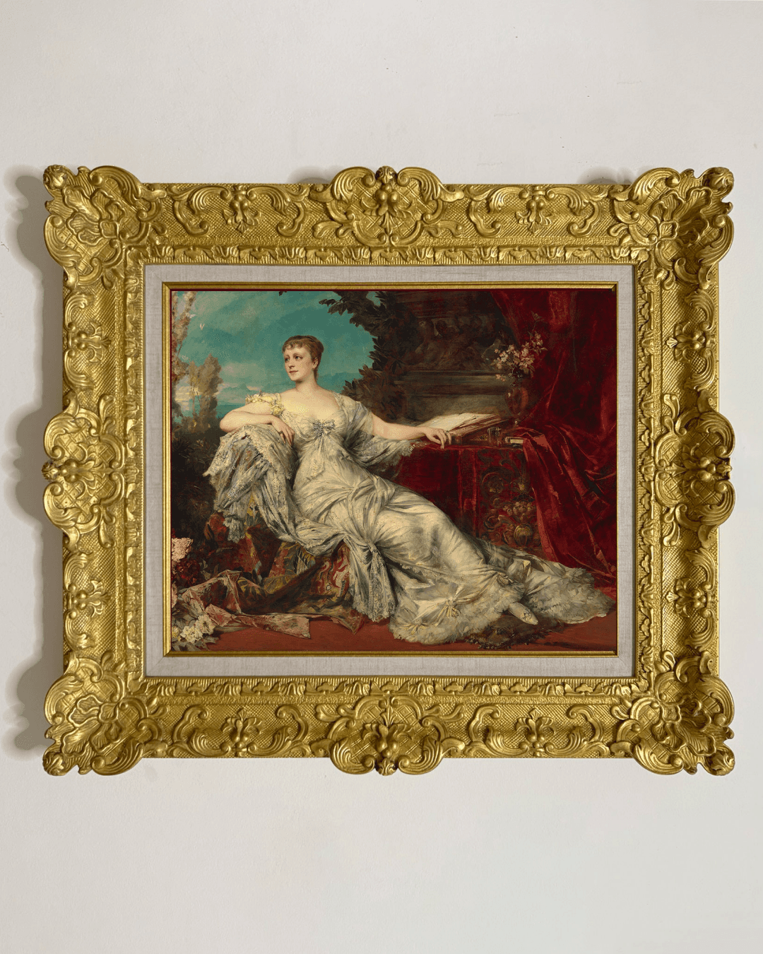กรอบรูปหลุยส์ไม้แท้ งานเก่ายุโรป ขนาดใหญ่ งานภาพพิมพ์ สไตล์ สีน้ำมันบนผ้าใบ ภาพ Portrait Of Countess Gabrielle Louise Marie Duchâtel (1854-1889), Wife Of The French Ambassador In Vienna Hans Makart (Austrian, 1840 - 1884)