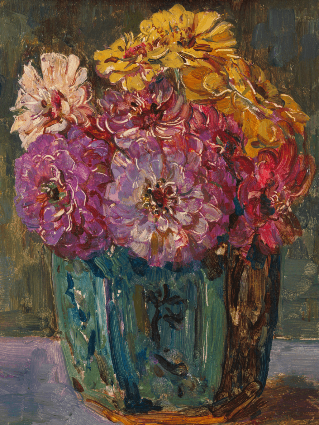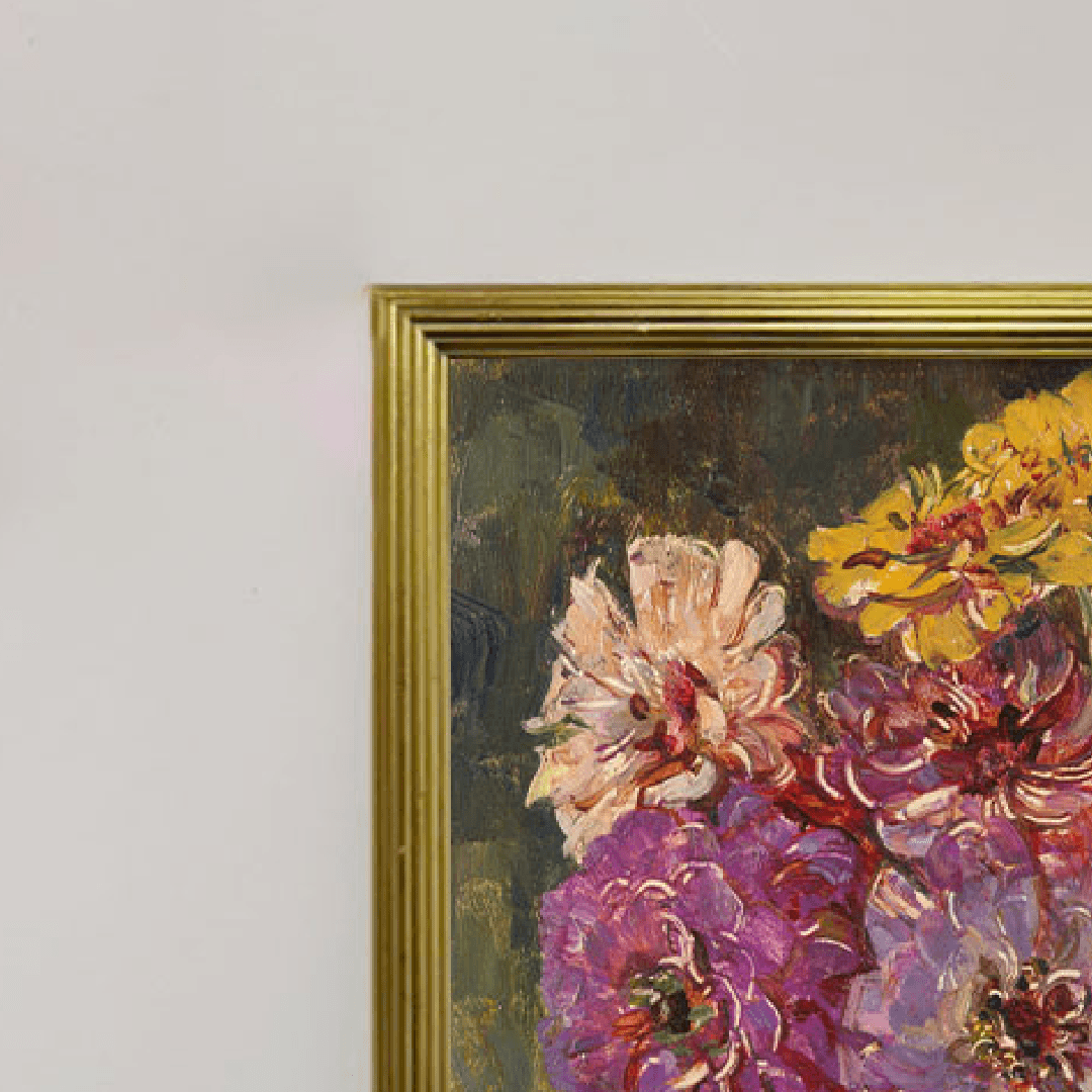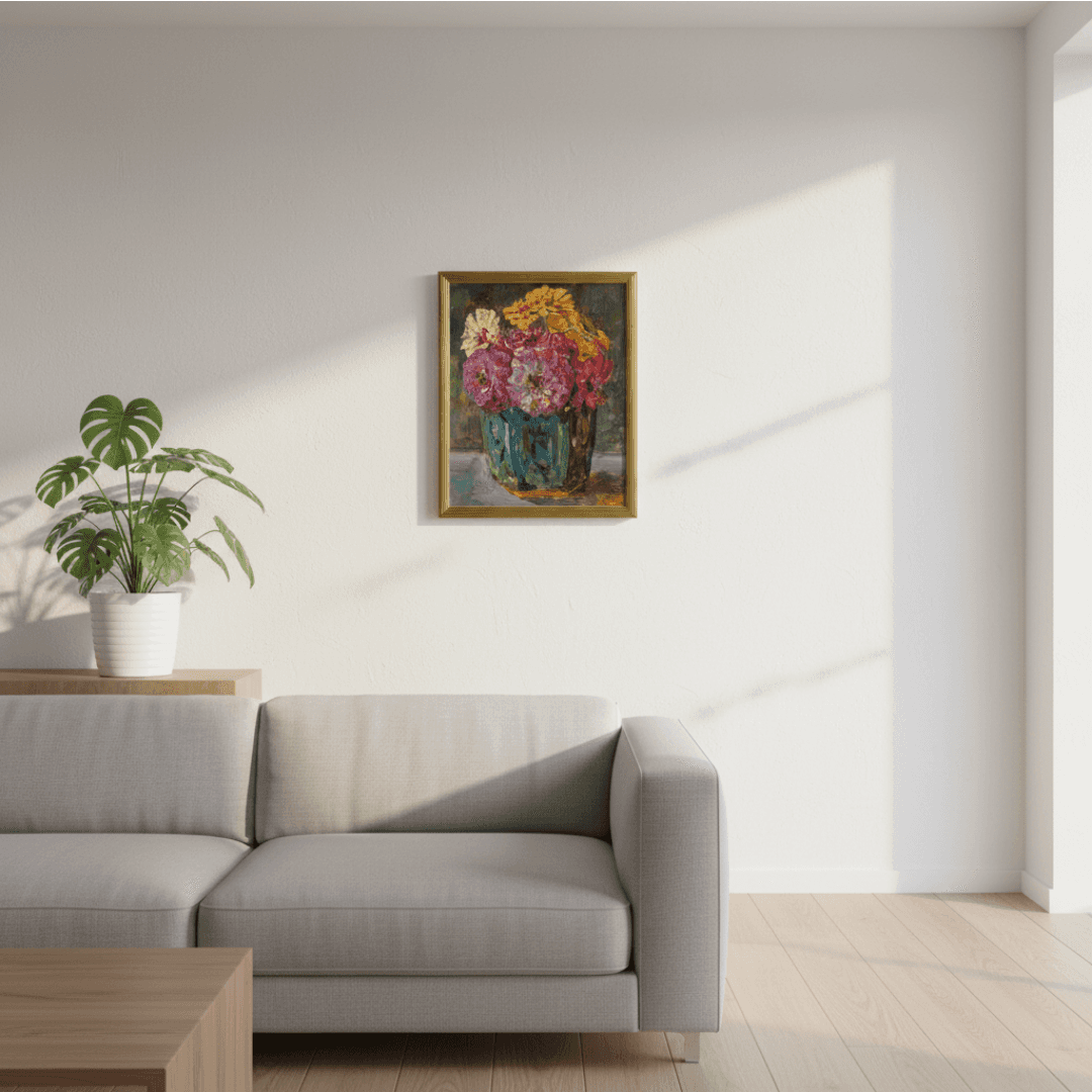 กรอบรูปโลหะสีทอง ภาพพิมพ์ สไตล์สีน้ำมัน บนผ้าใบ ภาพ Still Life with Zinnias in a green Jar Floris Verster, 1910