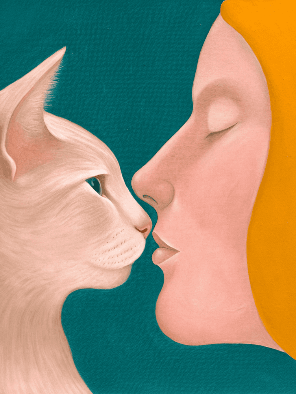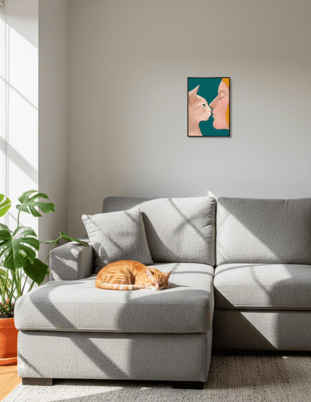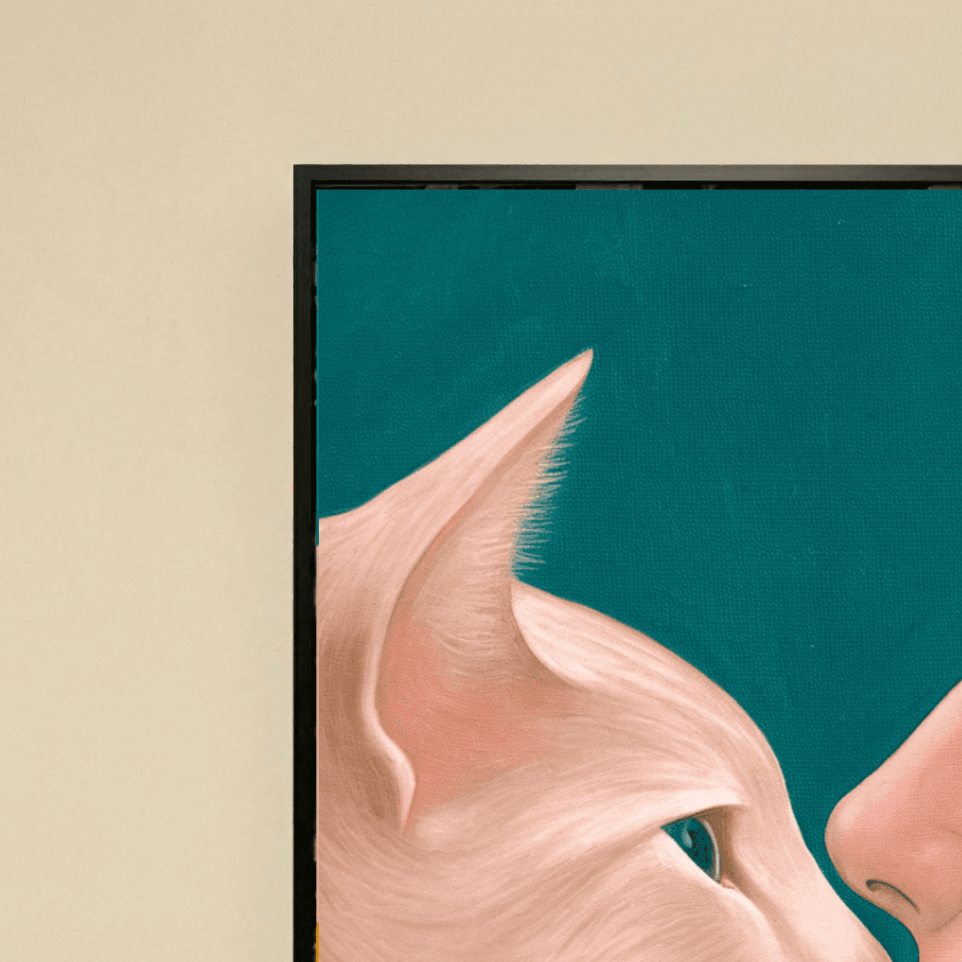 กรอบรูปโลหะสีดำด้าน ภาพพิมพ์ สไตล์สีน้ำมัน บนผ้าใบ ภาพ The Kissing Cat