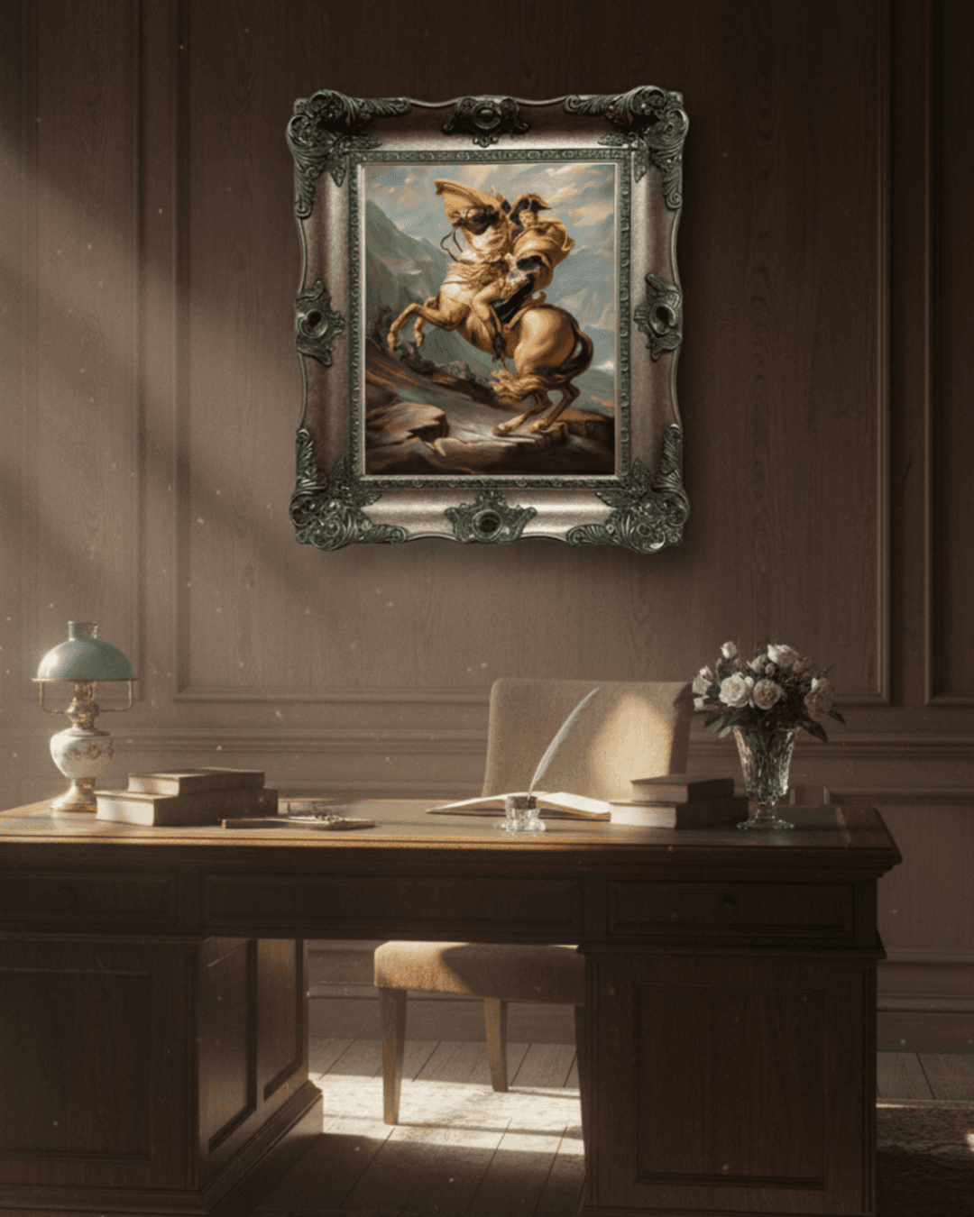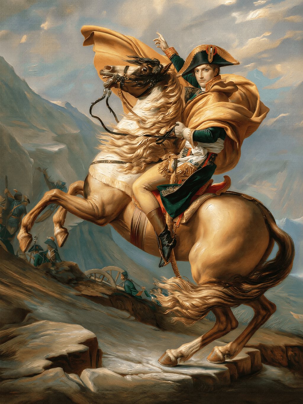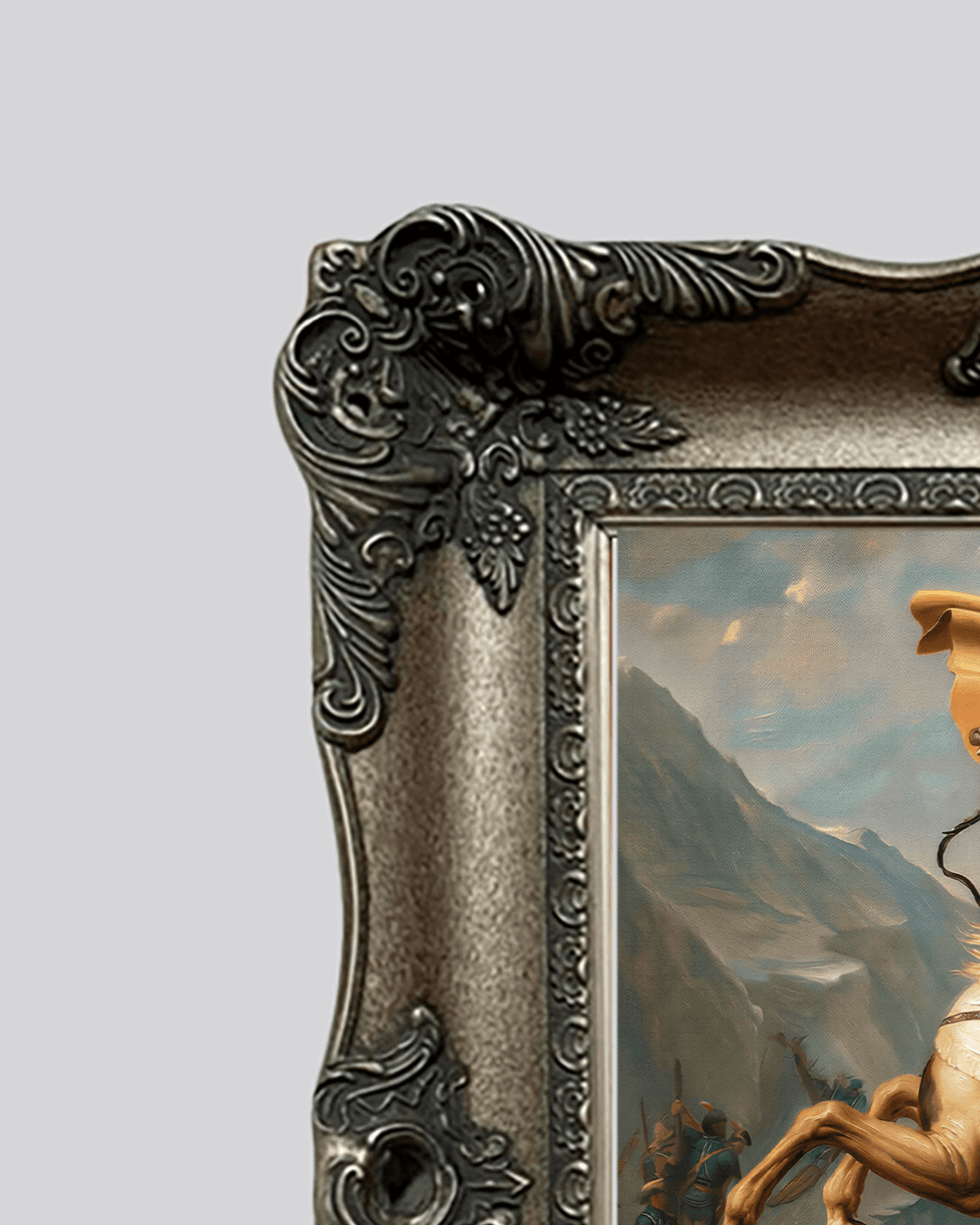 กรอบรูปหลุยส์ไม้แท้ งานเก่า สี Silver ขนาดใหญ่ พิมพ์ความละเอียดสูงสไตล์ สีน้ำมันบนผ้าใบ Re Imagination- Napoleon Crossing The Alps (1800) Jacques Louis David