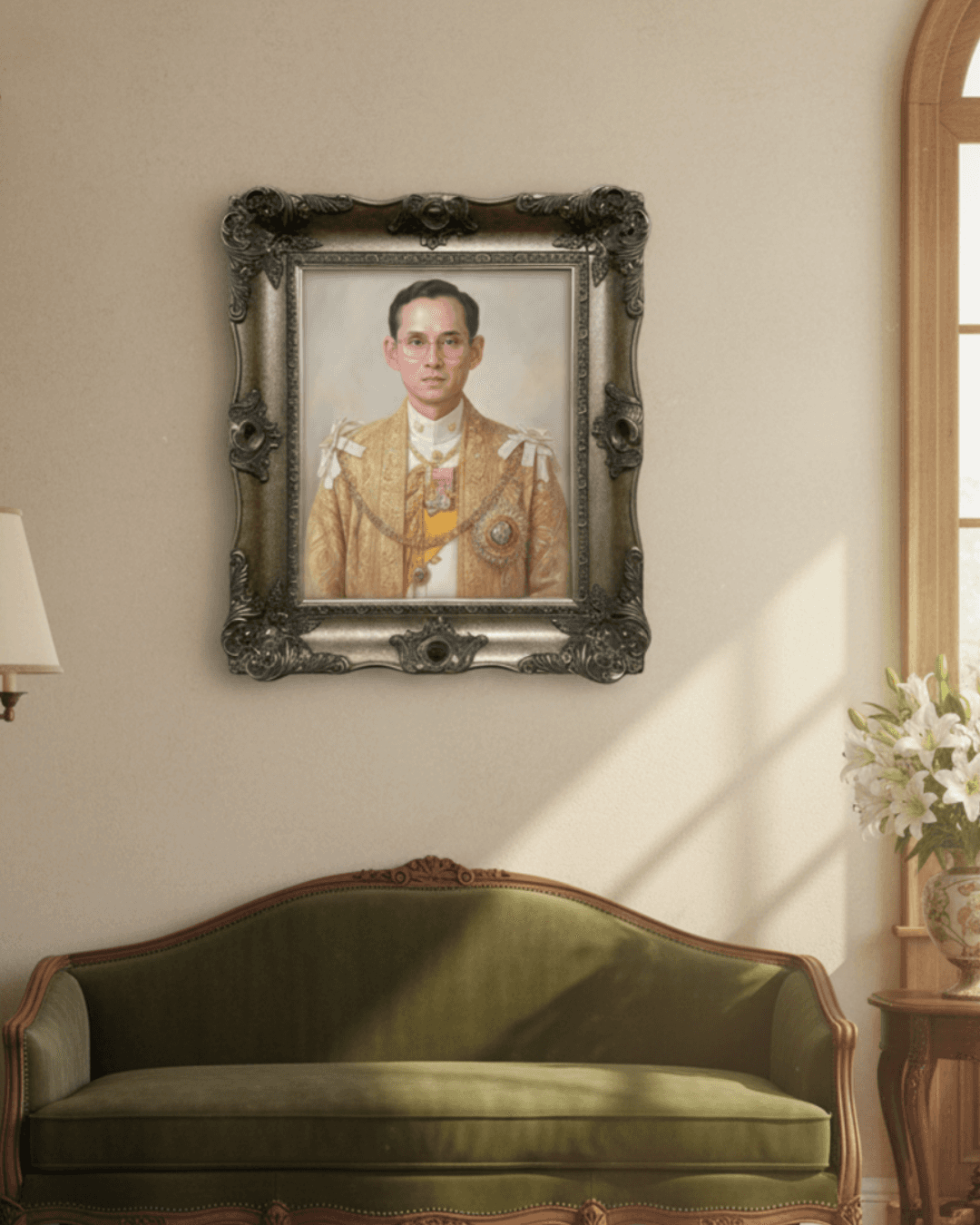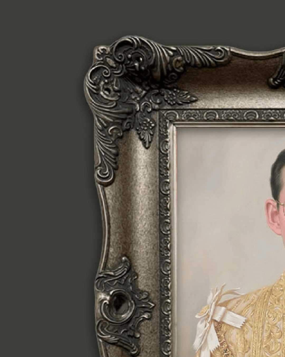 กรอบรูปหลุยส์ไม้แท้ งานเก่า สี Silver ขนาดใหญ่ ลายเก่า งานภาพพิมพ์ความละเอียดสูงสไตล์ สีน้ำมันบนผ้าใบ ภาพ รัชกาลที่ 9