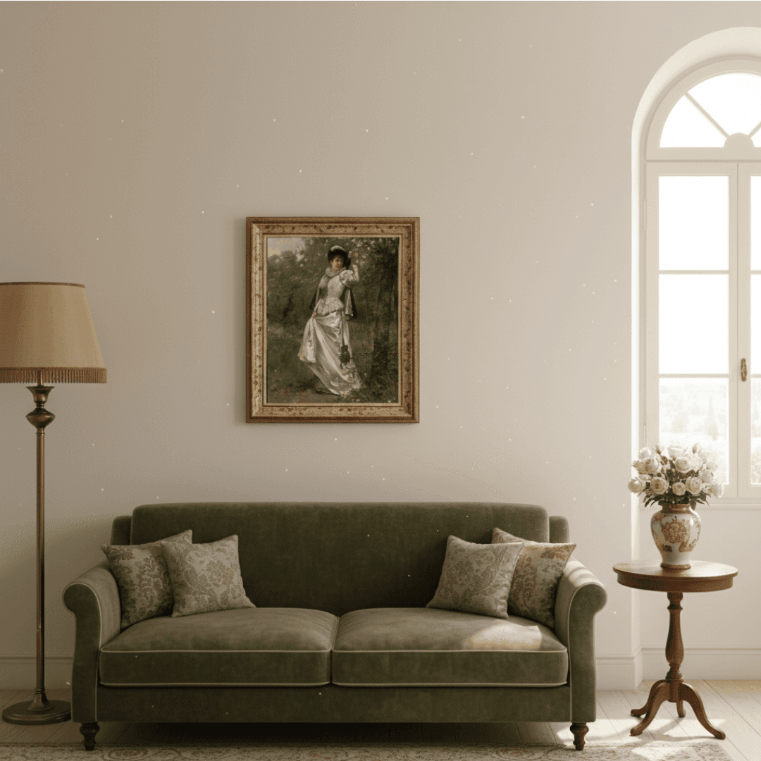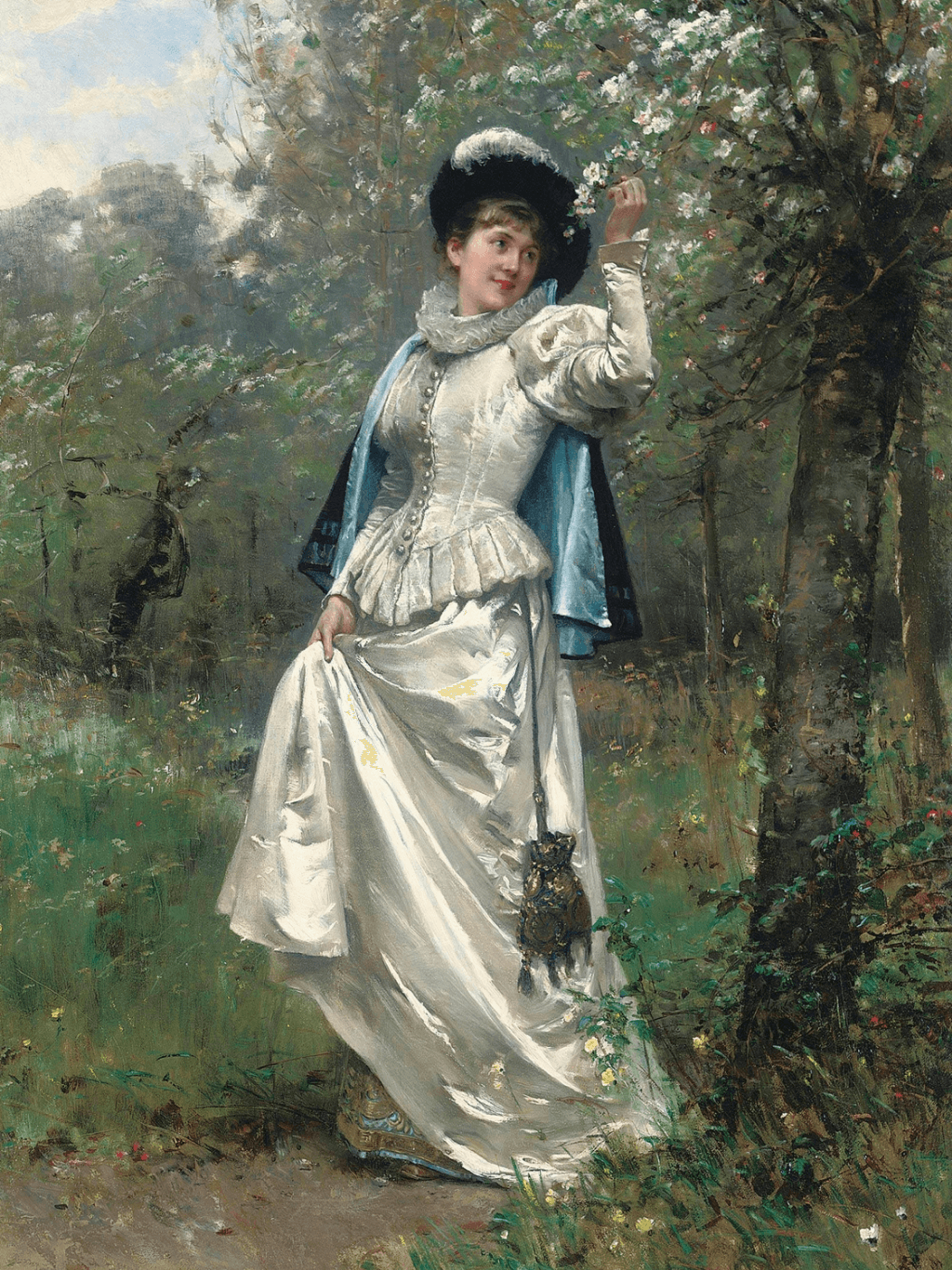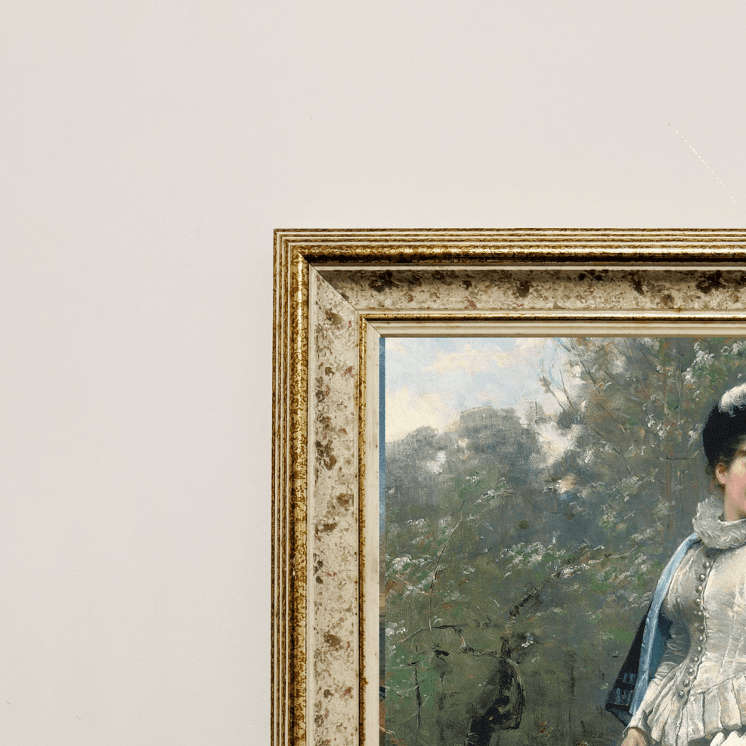 กรอบรูปลายไม้แท้งาน ลาย Vintage รุ่นเก่า งานภาพพิมพ์ สไตล์ สีน้ำมันบนผ้าใบ ภาพ Beneath the cherry blossom (1881) Adrien Moreau (French, 1843 - 1906)