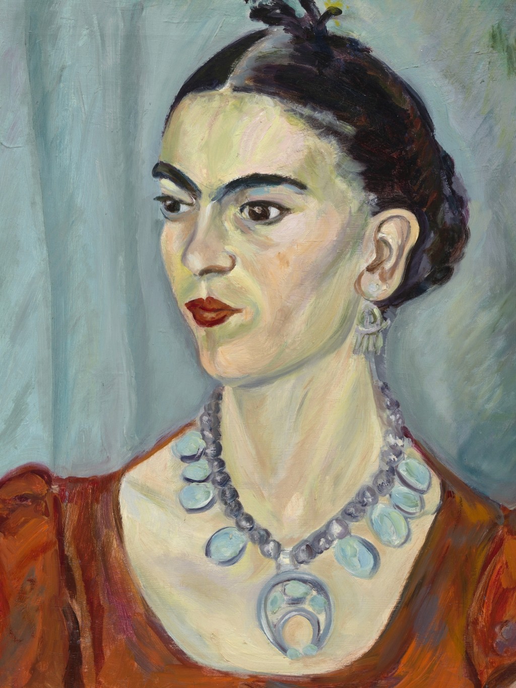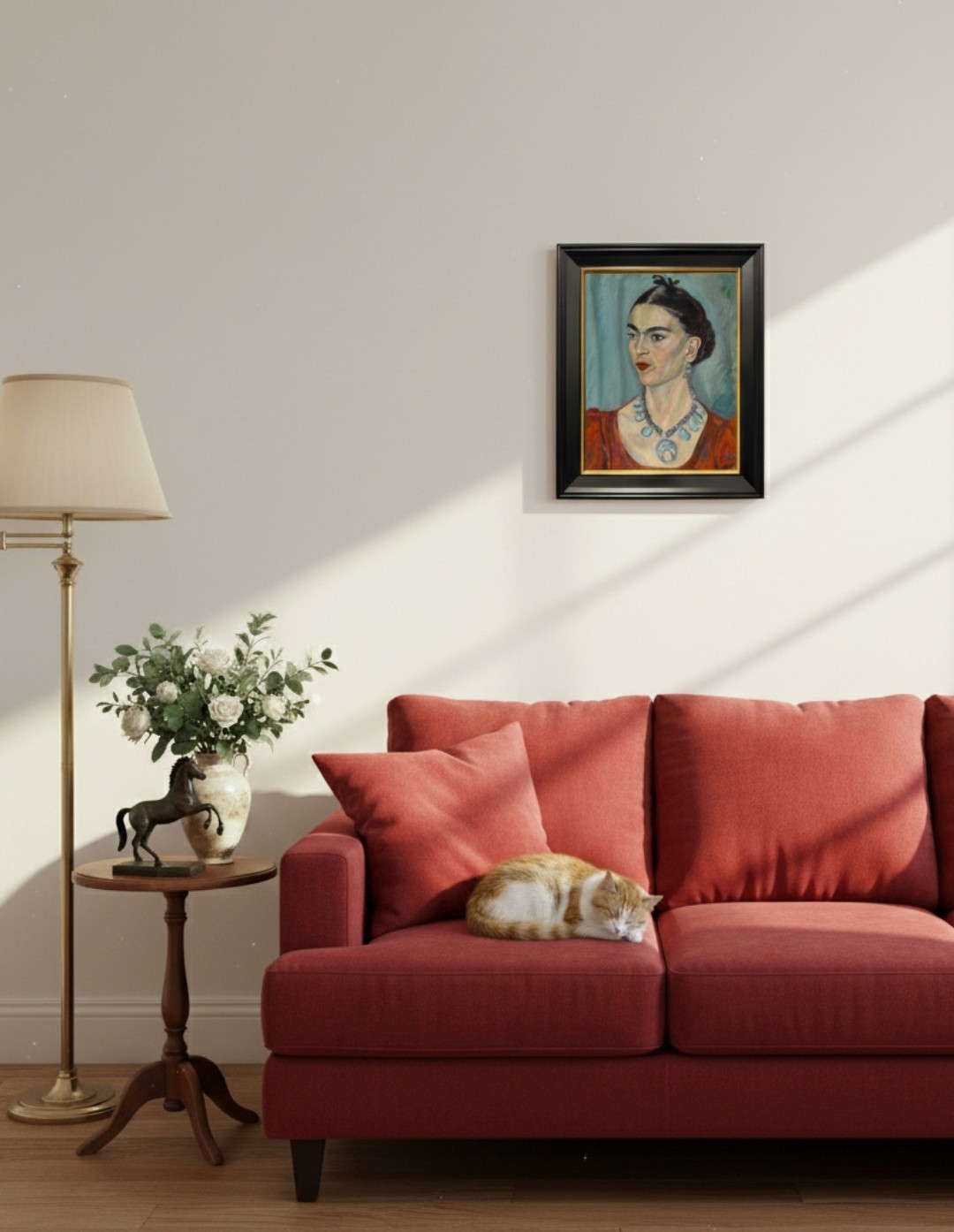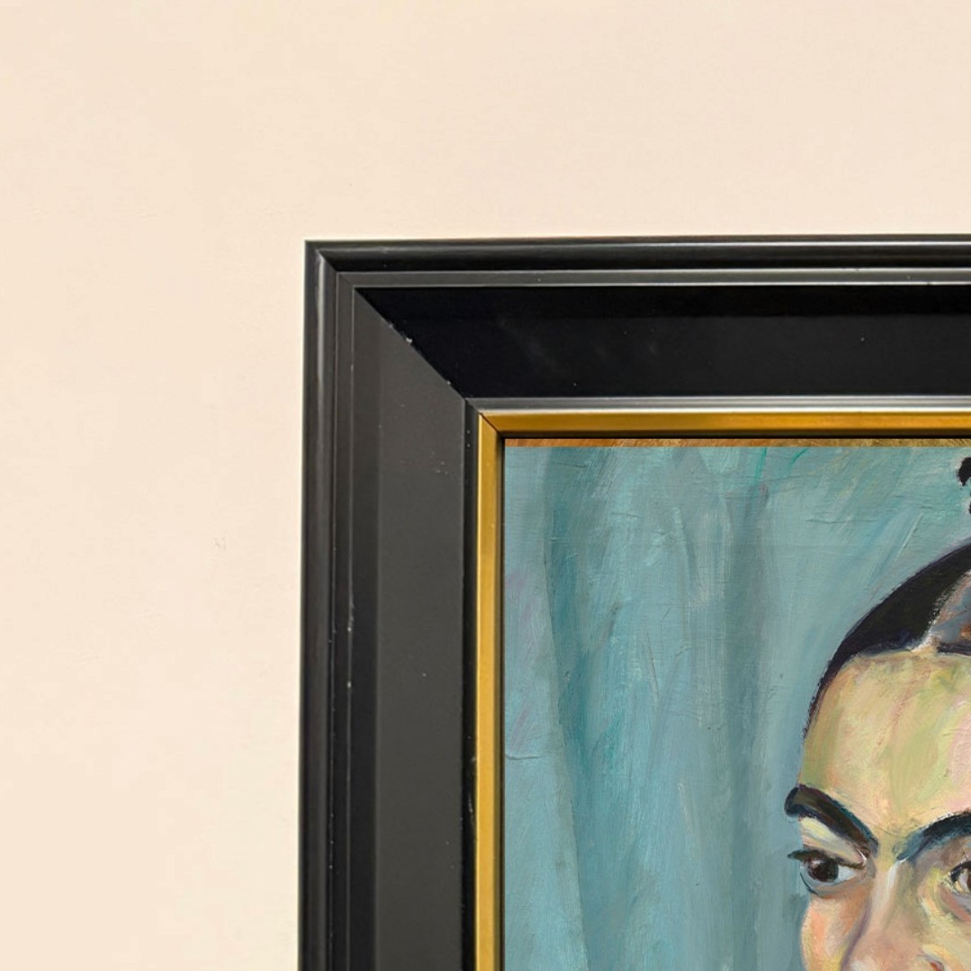 กรอบรูปสีดำด้านขอบทองด้านหน้าติดกระจกตัดแสงสะท้อน ภาพพิมพ์ สไตล์สีฝุ่น บนผ้าใบ ภาพ Frida Kahlo (1933), vintage woman portrait painting by Magda Pach