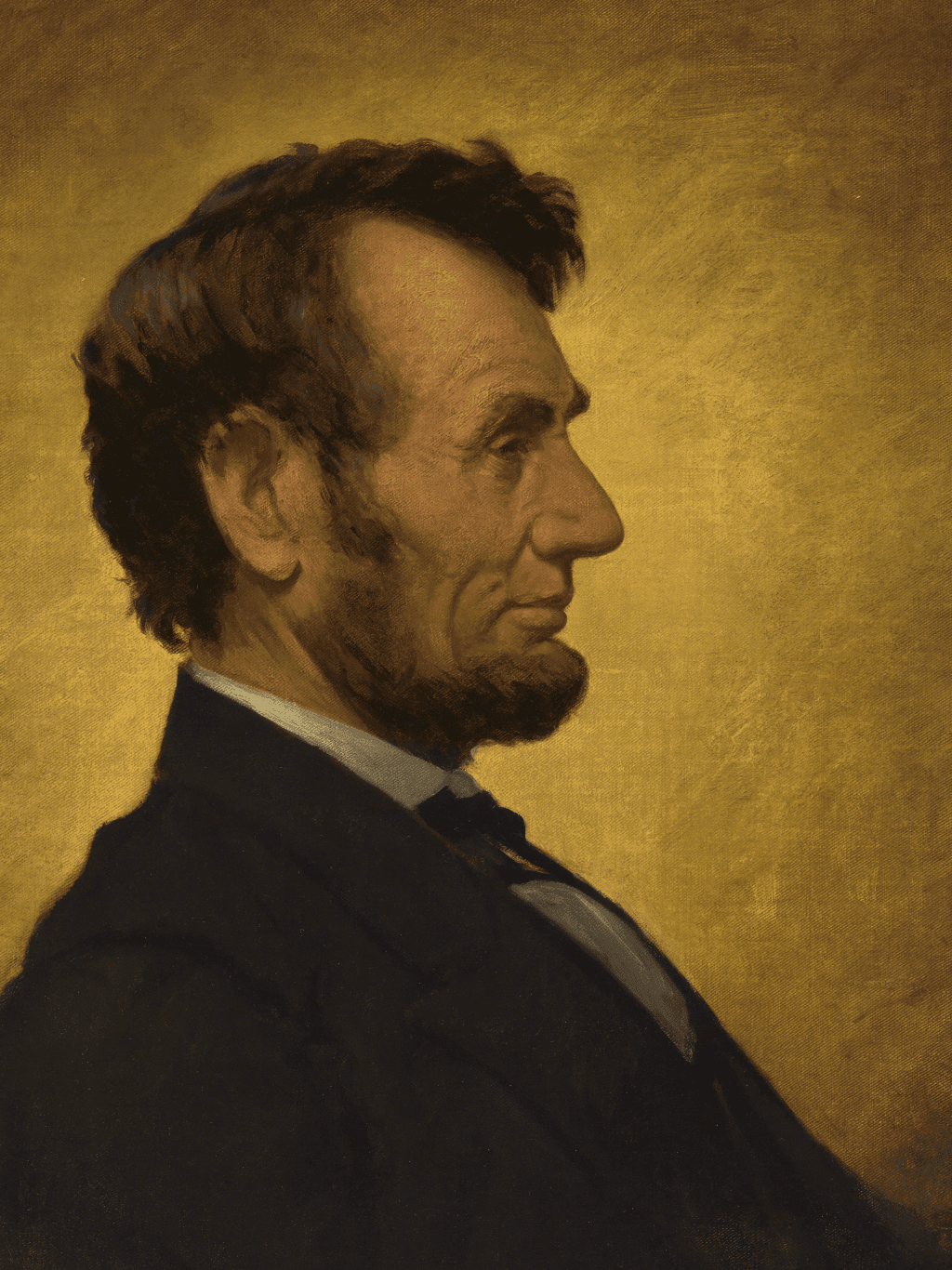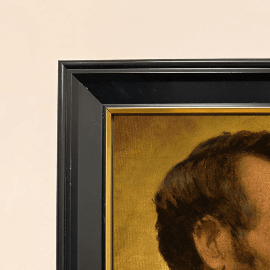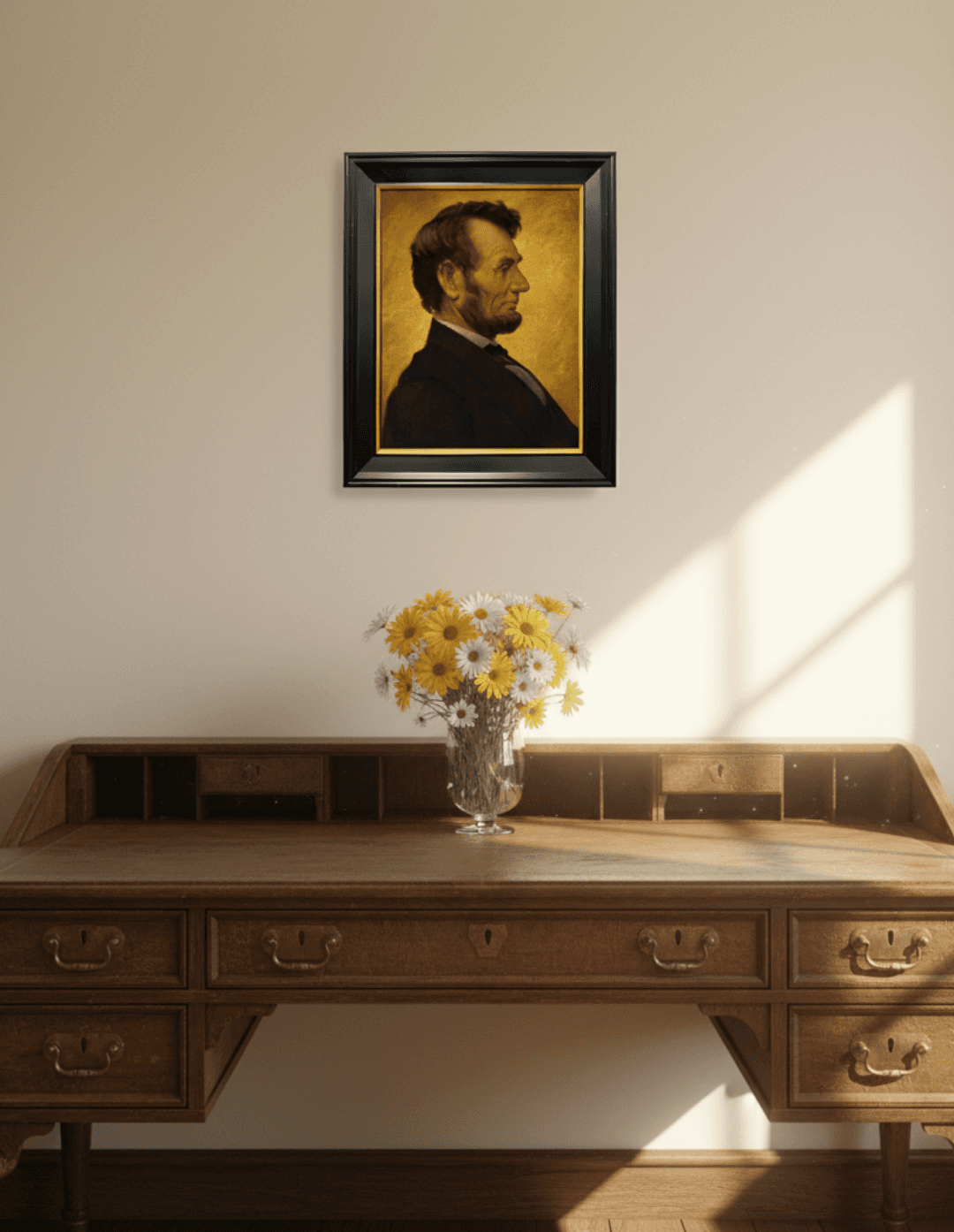 กรอบรูปสีดำด้านขอบทอง ภาพพิมพ์ สไตล์สีน้ำมัน บนผ้าใบ ภาพ Portrait of Abraham Lincoln by William Willard