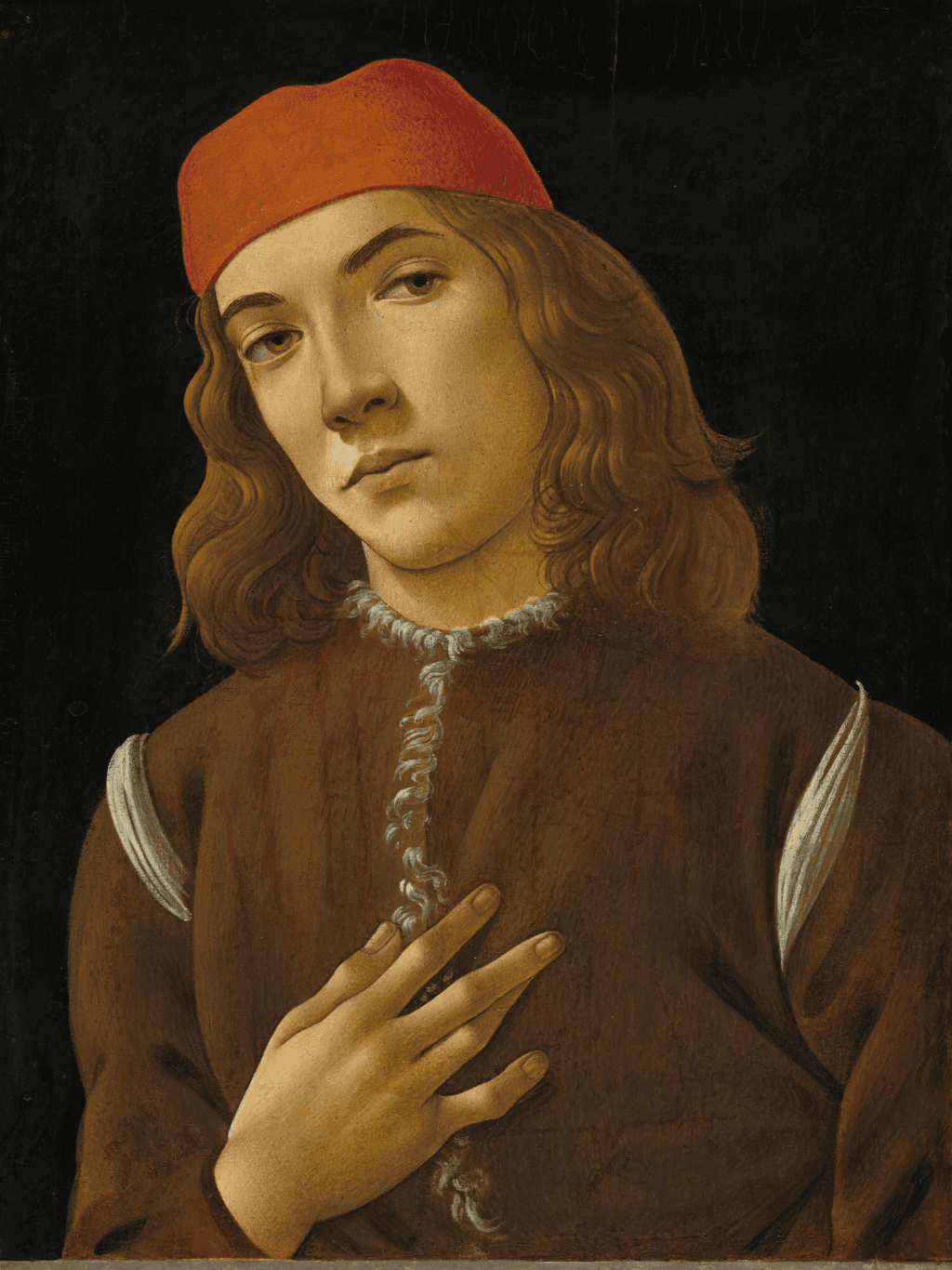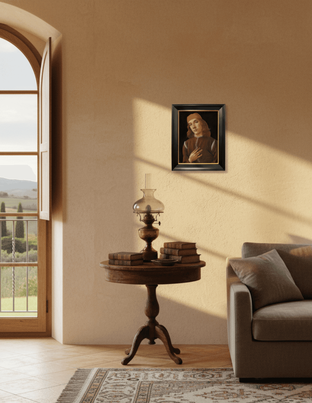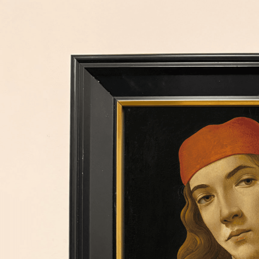 กรอบรูปสีดำด้านขอบทอง ภาพพิมพ์ สไตล์สีน้ำมัน บนผ้าใบ ภาพ Sandro Botticelli's Portrait of a Youth (c. 1482-1485)