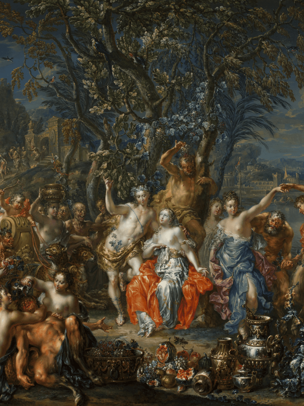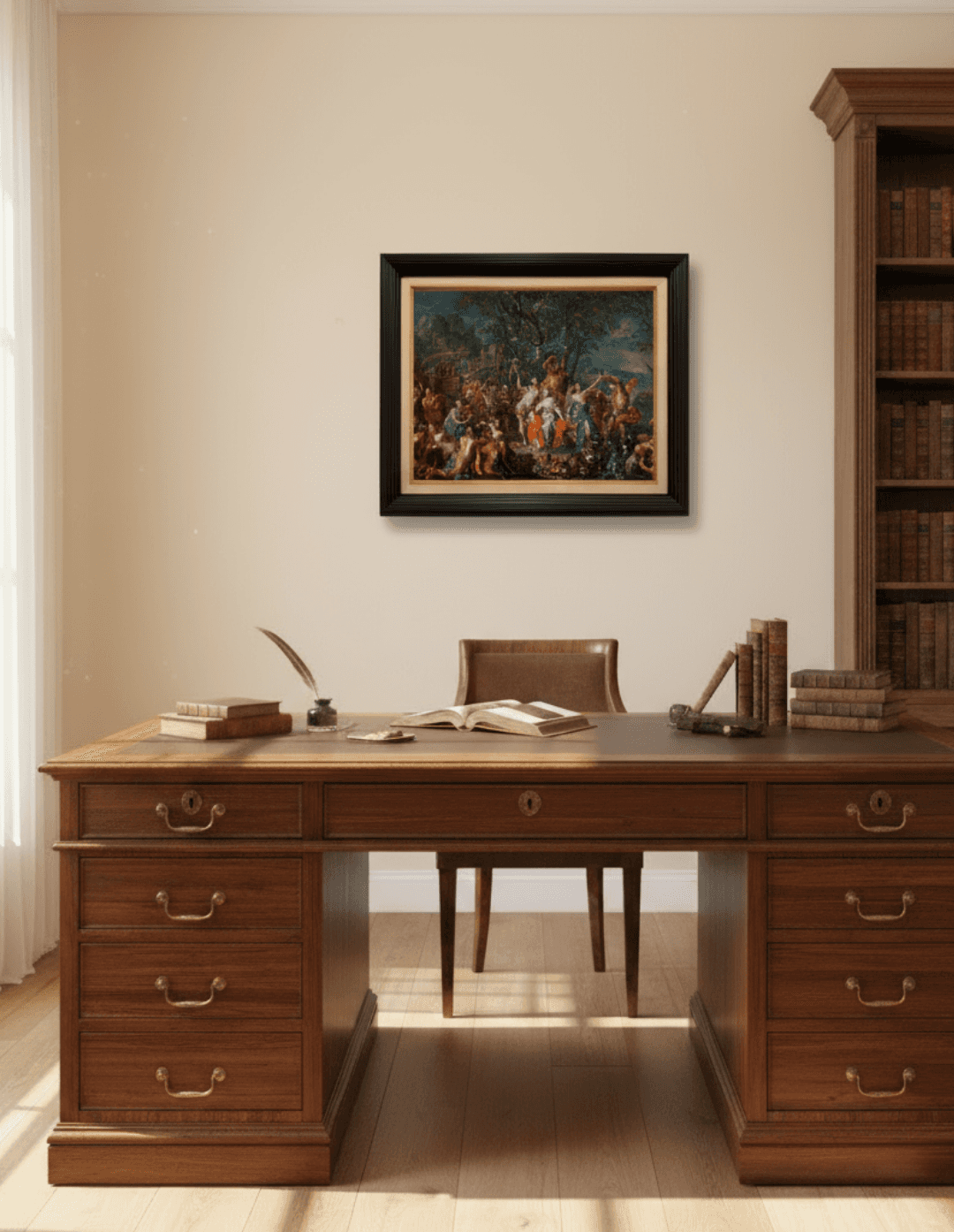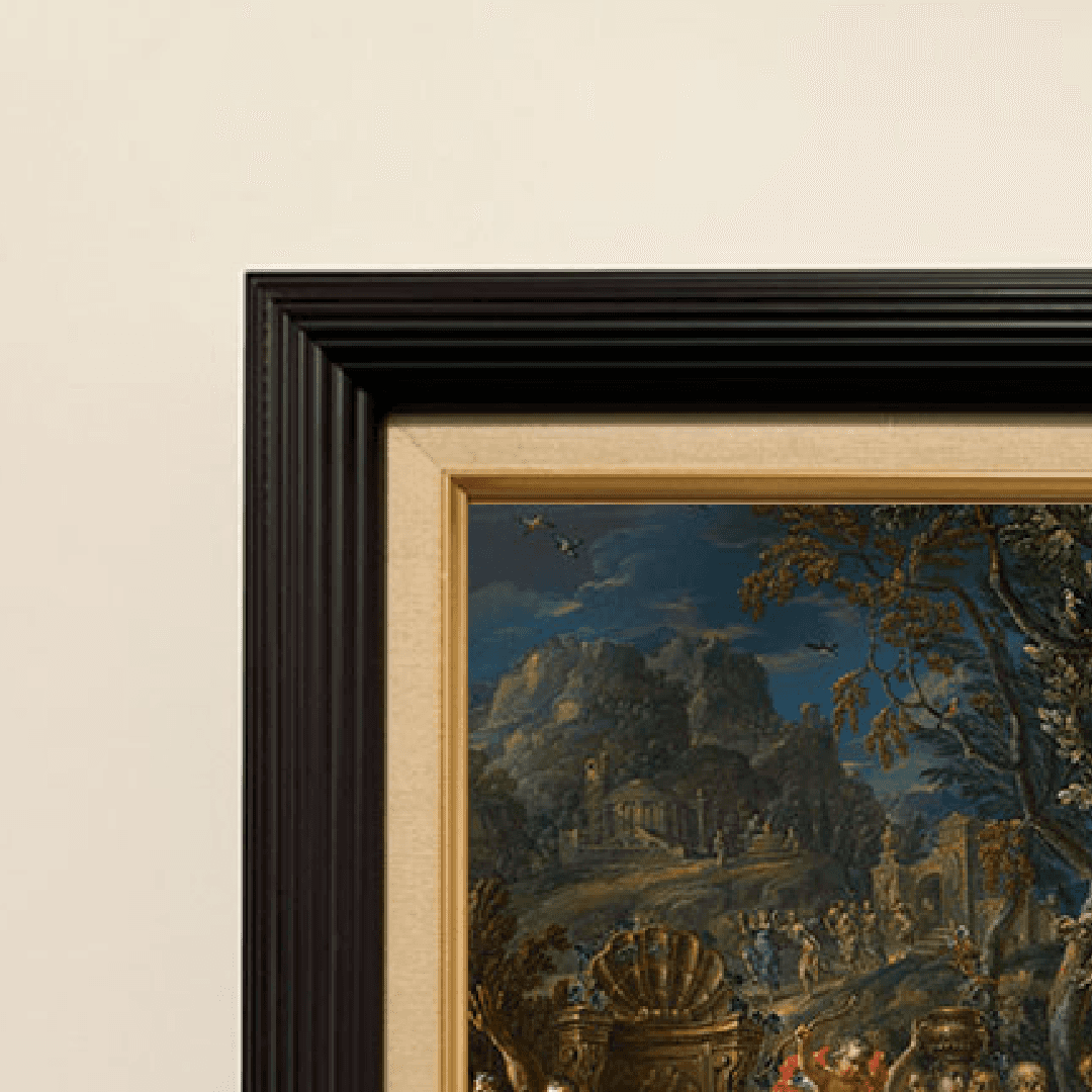 กรอบรูปสีดำด้านขอบลาย Vintage สภาพใหม่จากญี่ปุ่น ภาพพิมพ์ สไตล์สีน้ำมัน บนผ้าใบ ภาพ Bacchus and Ariadne ของ Johann Georg Platzer, Austrian, 1704–1761
