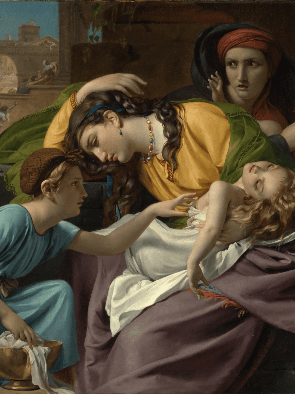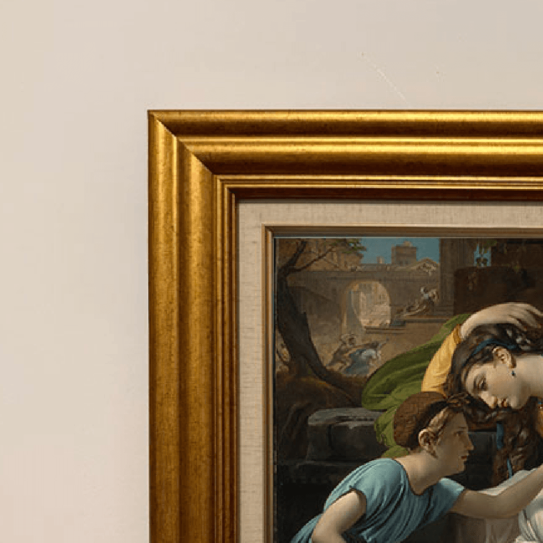 กรอบรูปสีทองสุกใสด้านหน้าติดกระจกตัดแสงสะท้อน ภาพพิมพ์ สไตล์สีฝุ่น บนผ้าใบ ภาพ The Massacre of the Innocents ของ François-Joseph Navez (1787–1869)