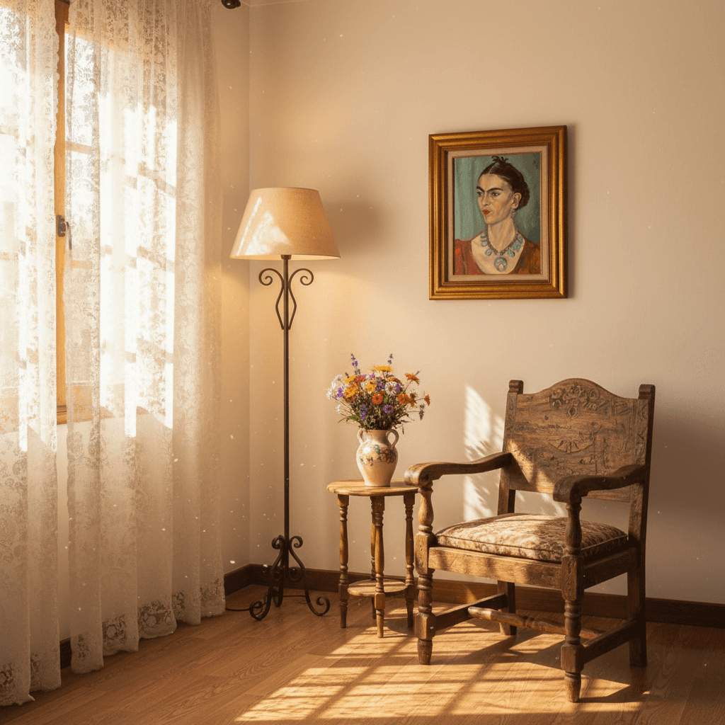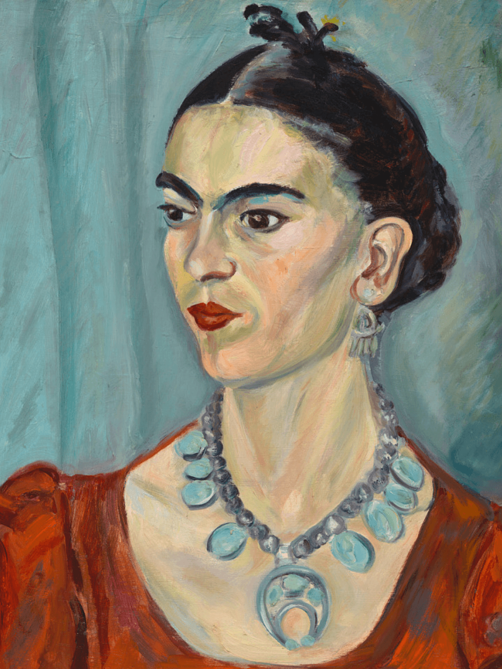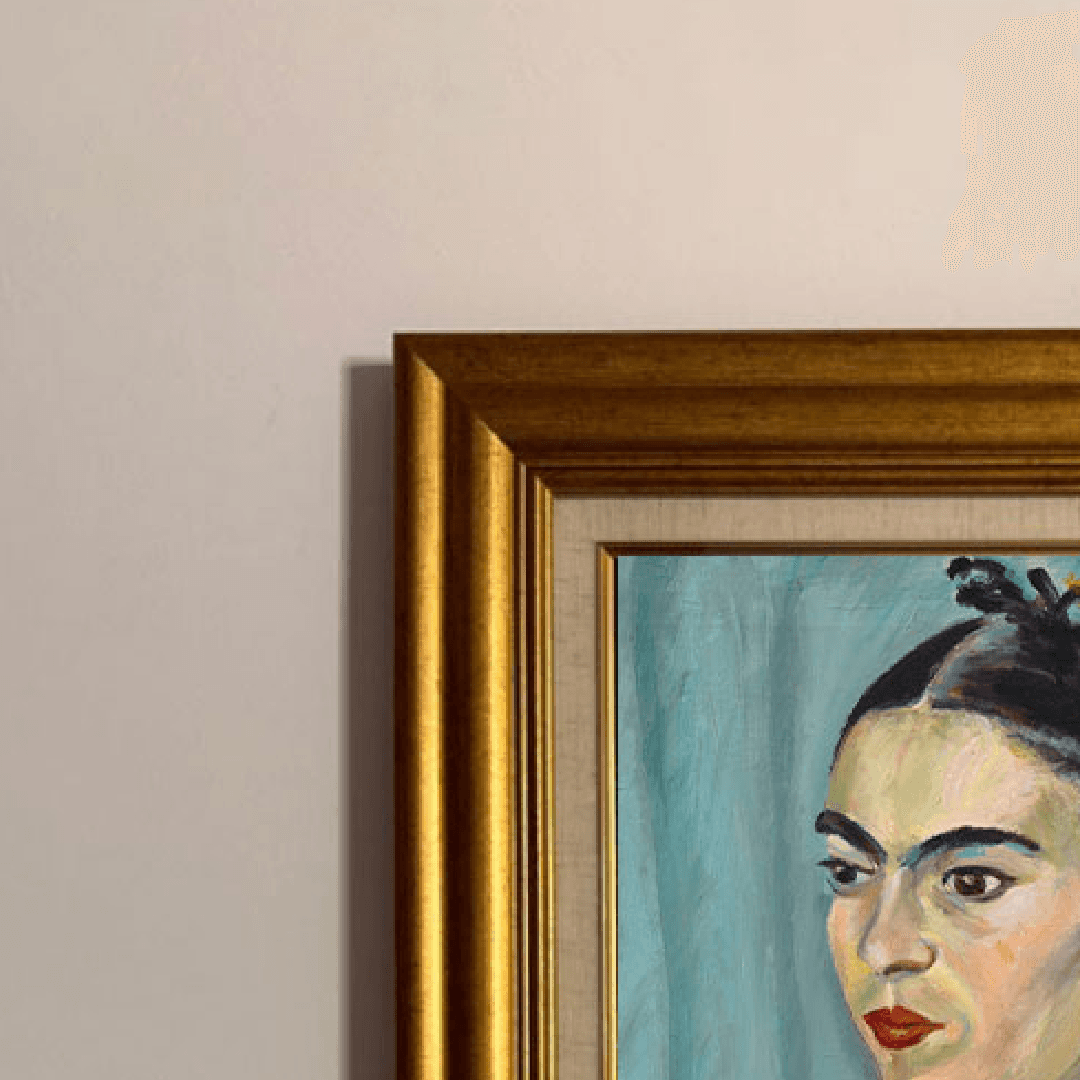 กรอบรูปสีทองสุกใสด้านหน้าติดกระจกตัดแสงสะท้อน ภาพพิมพ์ สไตล์สีน้ำมันบนผ้าใบ ภาพ Portrait Frida Kahlo by Magda Pach, 1884 - 1950