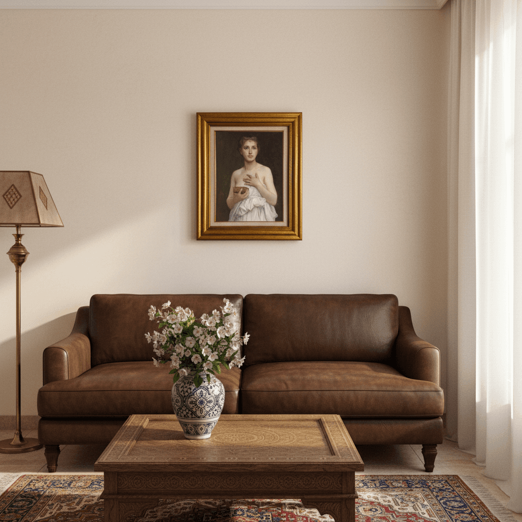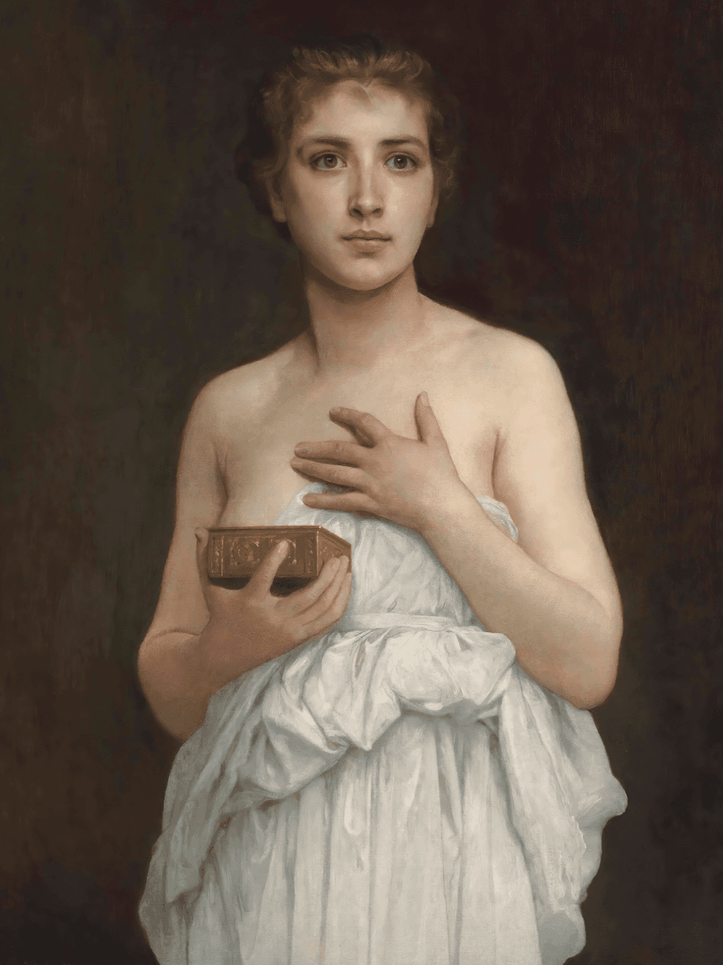 กรอบรูปสีทองสุกใสด้านหน้าติดกระจกตัดแสงสะท้อน ภาพพิมพ์ สไตล์สีน้ำมันบนผ้าใบ ภาพ Pandore (1890) William Bouguereau (French, 1825-1905)