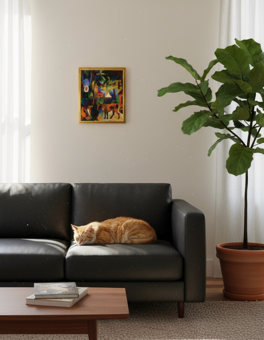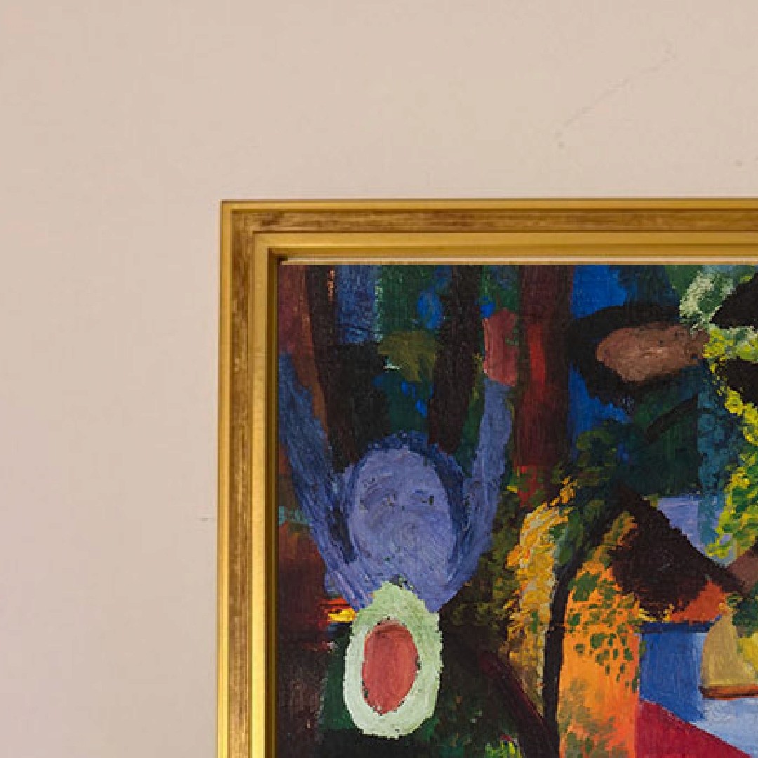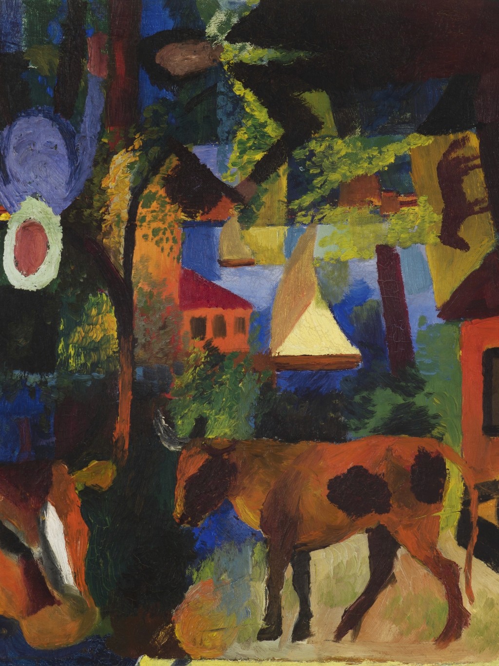 กรอบรูปทองแบบ Vintage สภาพใหม่ ภาพพิมพ์ สไตล์สีน้ำมัน บนผ้าใบ ภาพของ August Macke's ภาพ Landscape with Cows, Sailboat, and Painted-in Figures